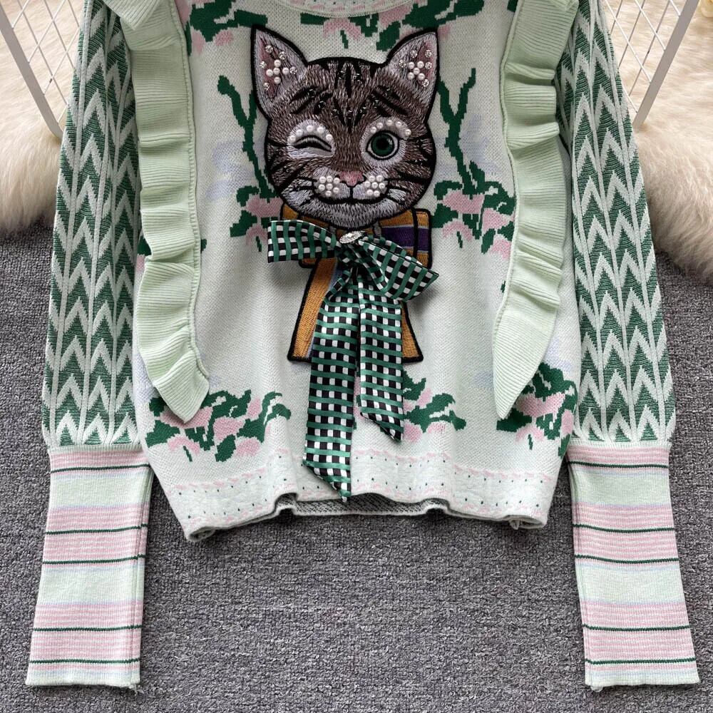 ピンク原宿ダイヤモンドビーズ猫弓刺繍セーターフリルフラワージャカード漫画プルオーバージャンパークロップトップス リボン ラッフル かわいい フラワーデザイン