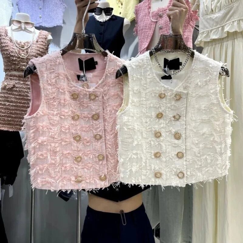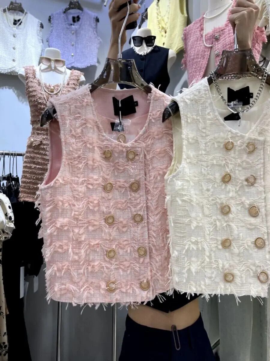 ノースリーブダブルブレストラウンドネック小さ香りスタイルピンクベストジャケット Chalecos 丈丈テルベストトップスタンク Oネック
