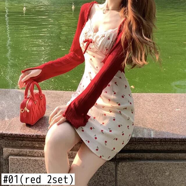 ショートブラックカーディガン花柄スリングドレスチェリー V ネックプリントショートスカート中断スリムパーティービーチ衣装 2 セット Vネック