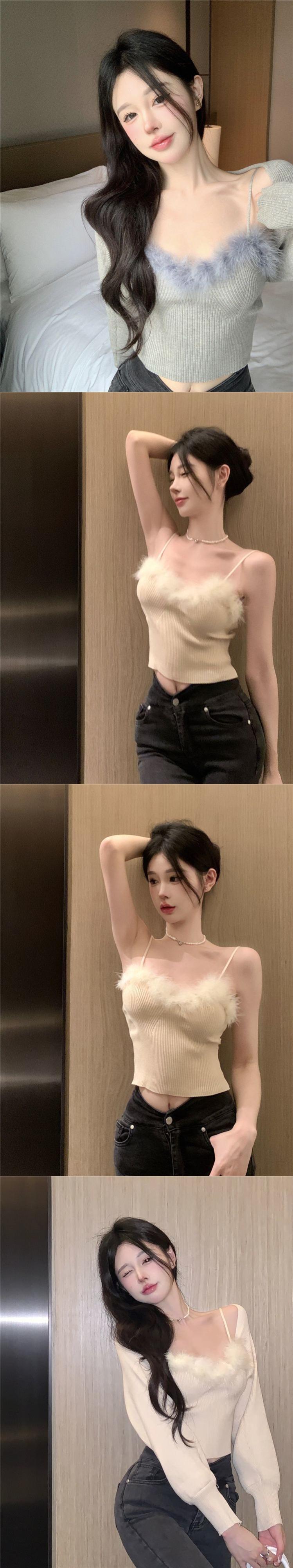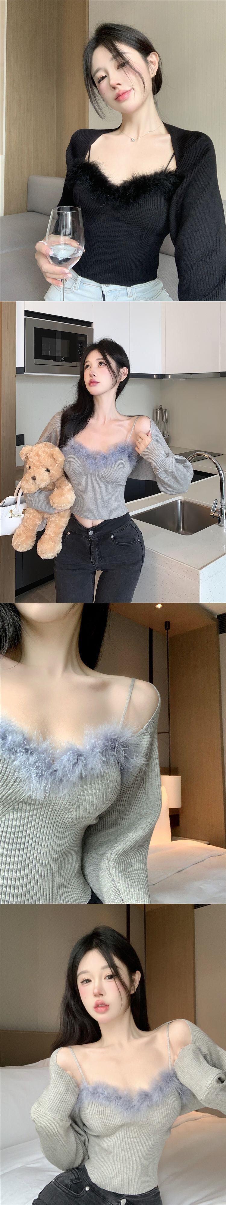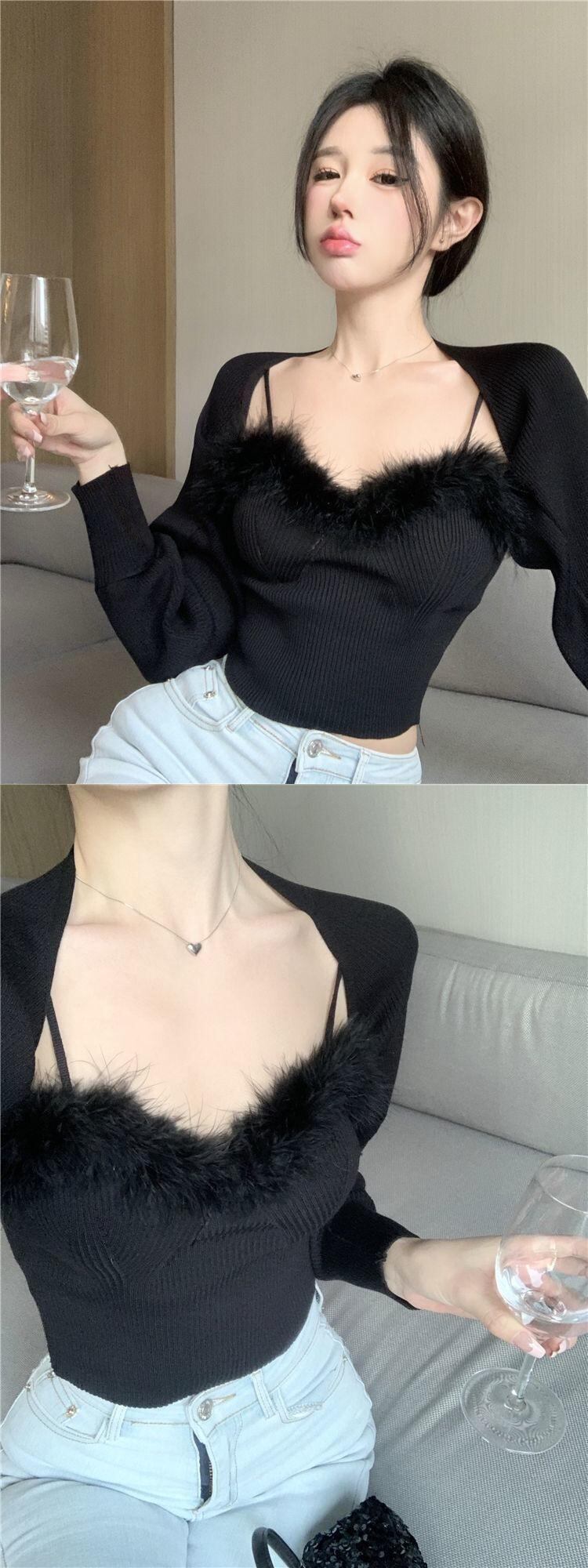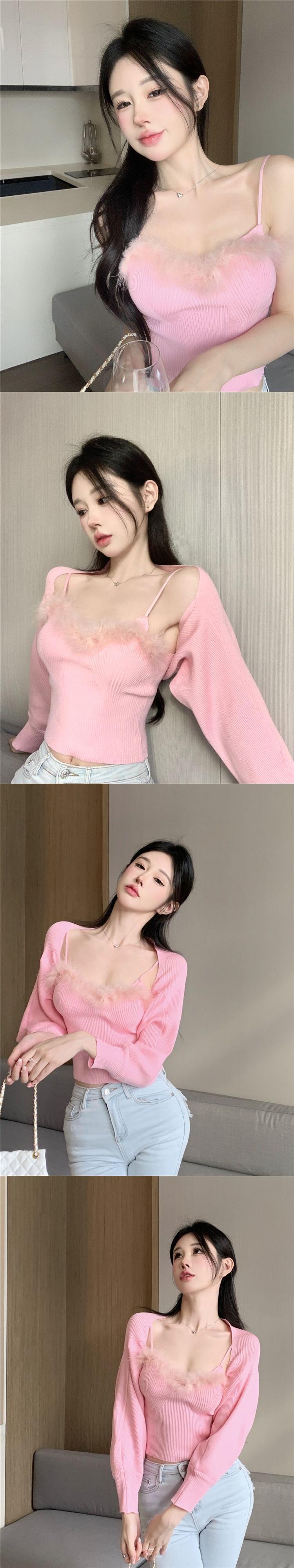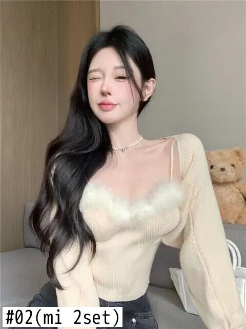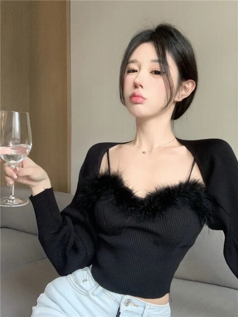 毛皮ニット 2 個セットクロップトップスセクシースリングベスト長袖カーディガンコート衣装 Ropa シックチュニックスーツ Y2k ロング