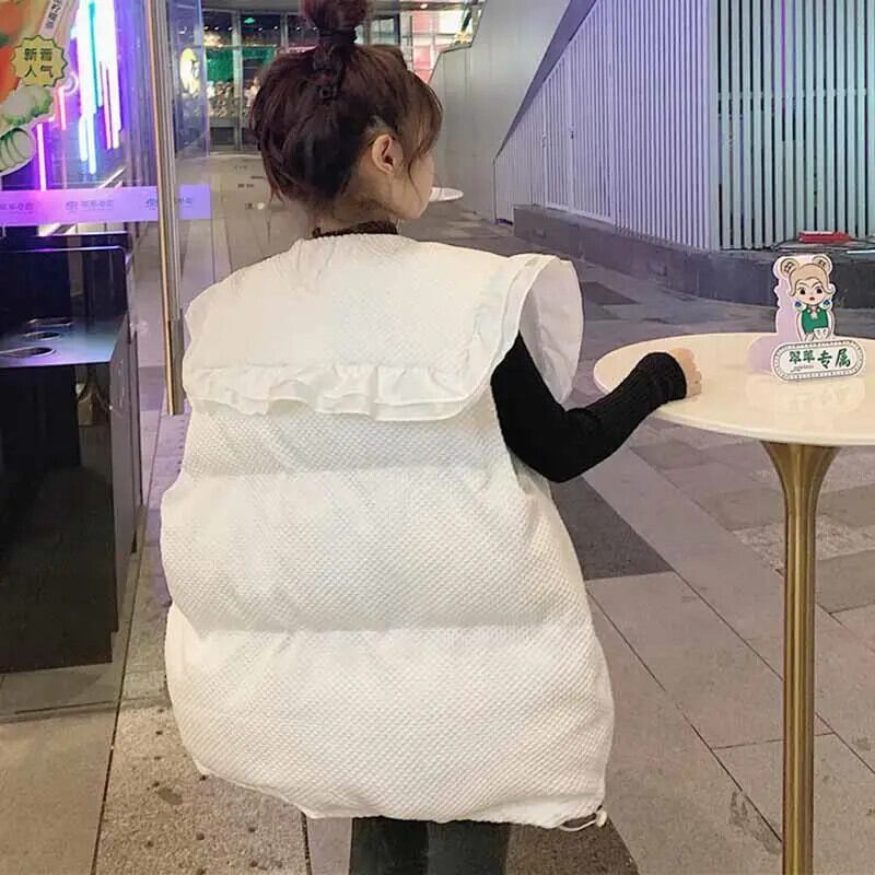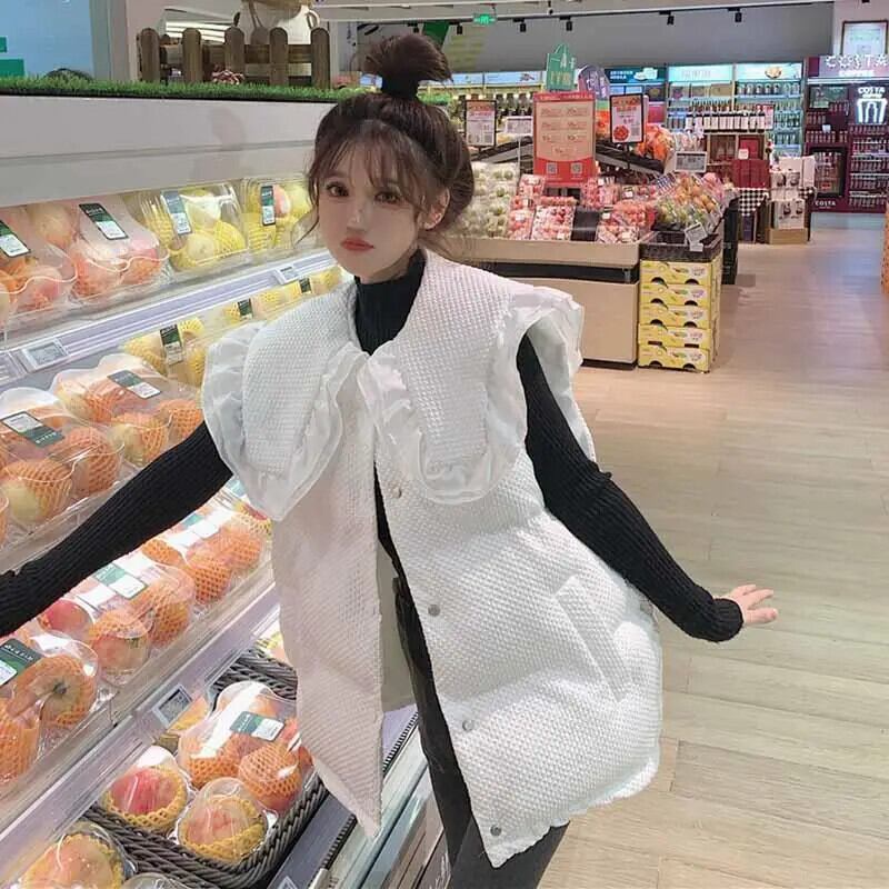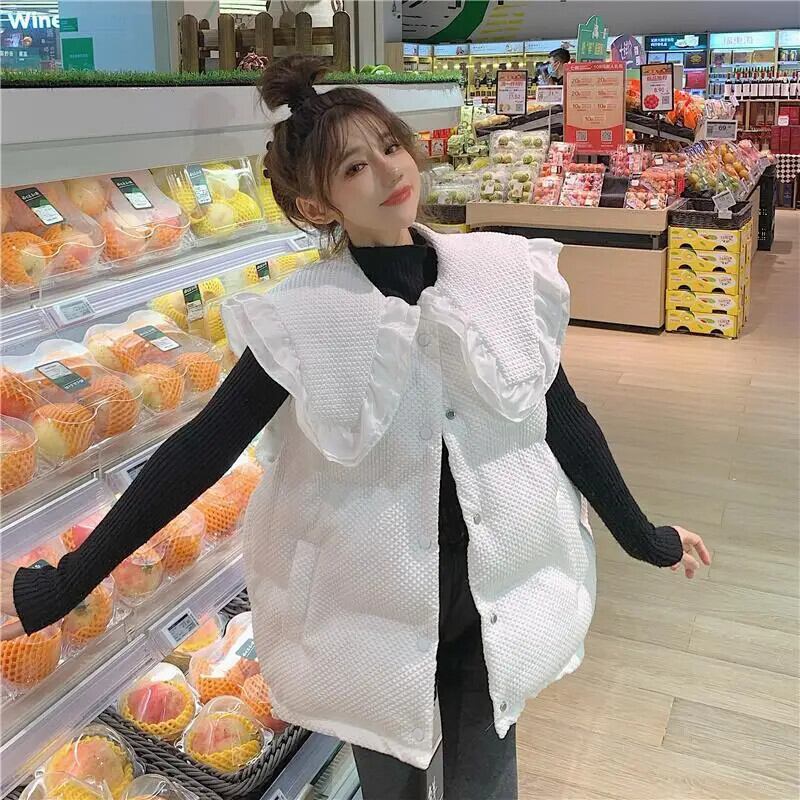 ホワイト秋冬ルーズダウン綿ベスト蓮葉人形襟学生チョッキ黒パーカートップ ブラック コットン オータム 秋物 ウィンター 冬物