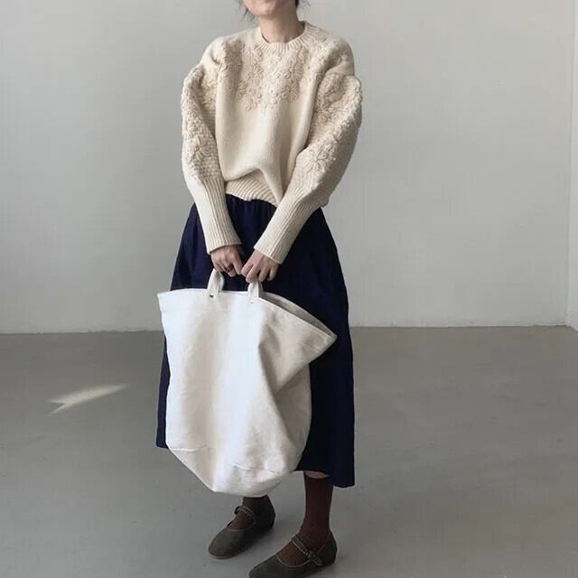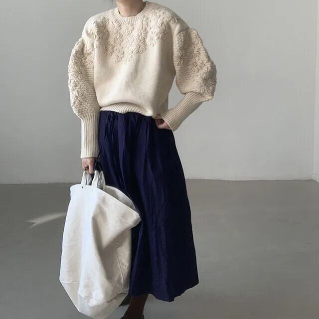 セーター O ネックランタンスリーブニットプルオーバートップス 3D 刺繍花ジャンパー秋冬デイジー オータム 秋物 ウィンター 冬物 花柄 Oネック