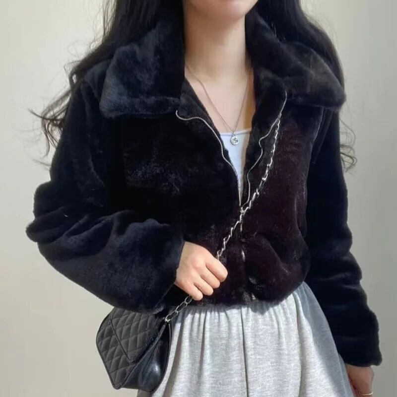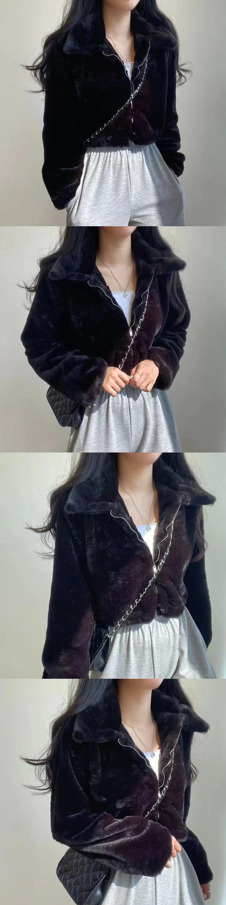 ファー & フェイクファーふわふわジャケット黒フェイクファーコートターンダウン襟暖かいショートカーディガントップ秋レトロ ブラック オータム 秋物