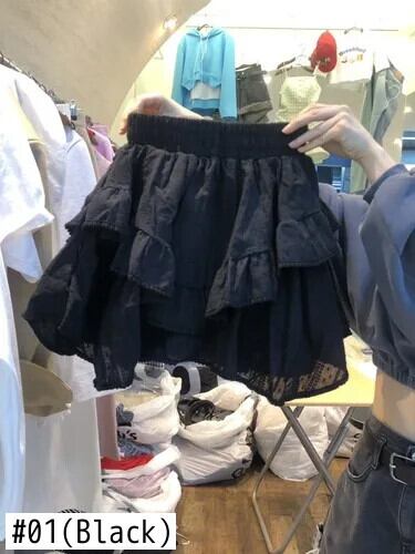 秋不規則フリル弾性ウエスト A ラインスカートファルダスモーダ甘いペチコート黒スカートレースシャツ ブラック エラスティック 伸縮 大人ガーリー スウィート キュート カジュアル オータム 秋物 Aライン