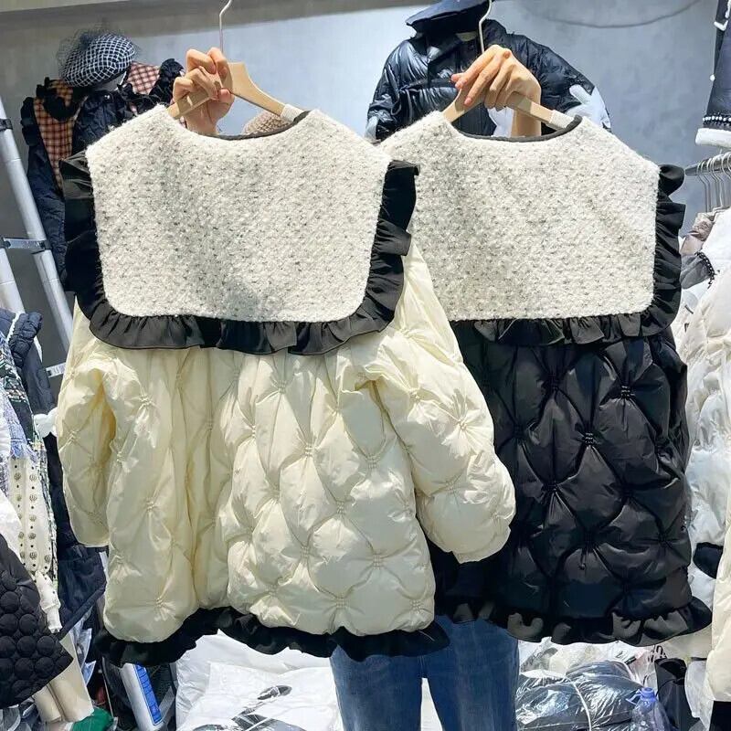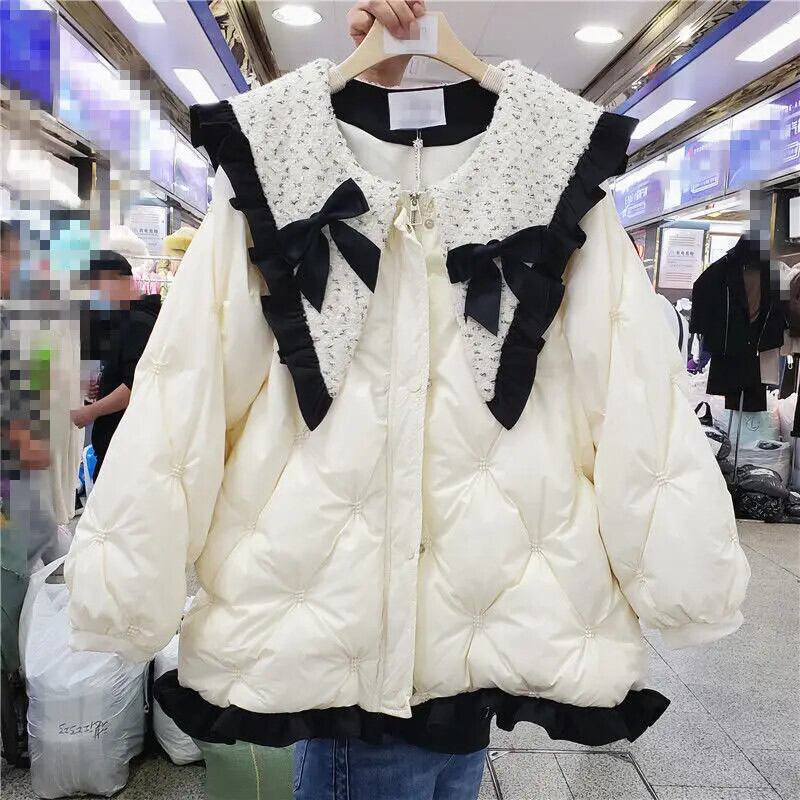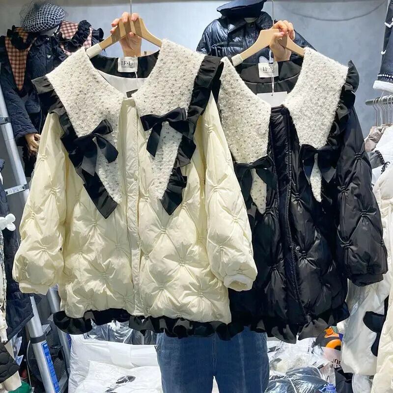 弓ネイビーカラー冬コートフリルビッグラペルルーズパーカーパッチワークスリーブ生き抜くジャケット Feamle コート リボン ウィンター 冬物