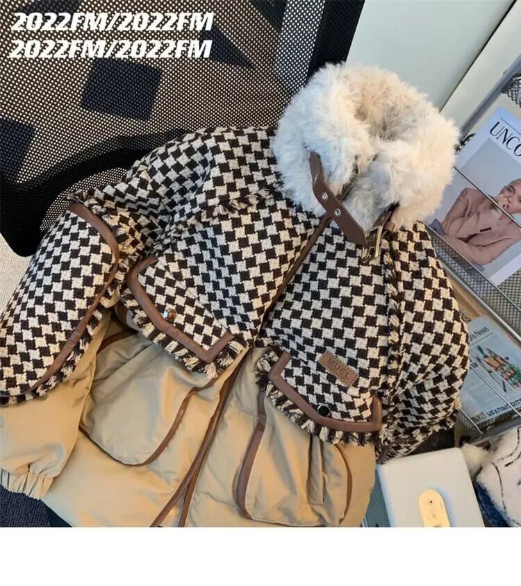 厚い冬コートパッチワークパーカー暖かいラムウールコート襟パーカー毛皮フグチェック柄ジャケットルーズトップ ウィンター 冬物