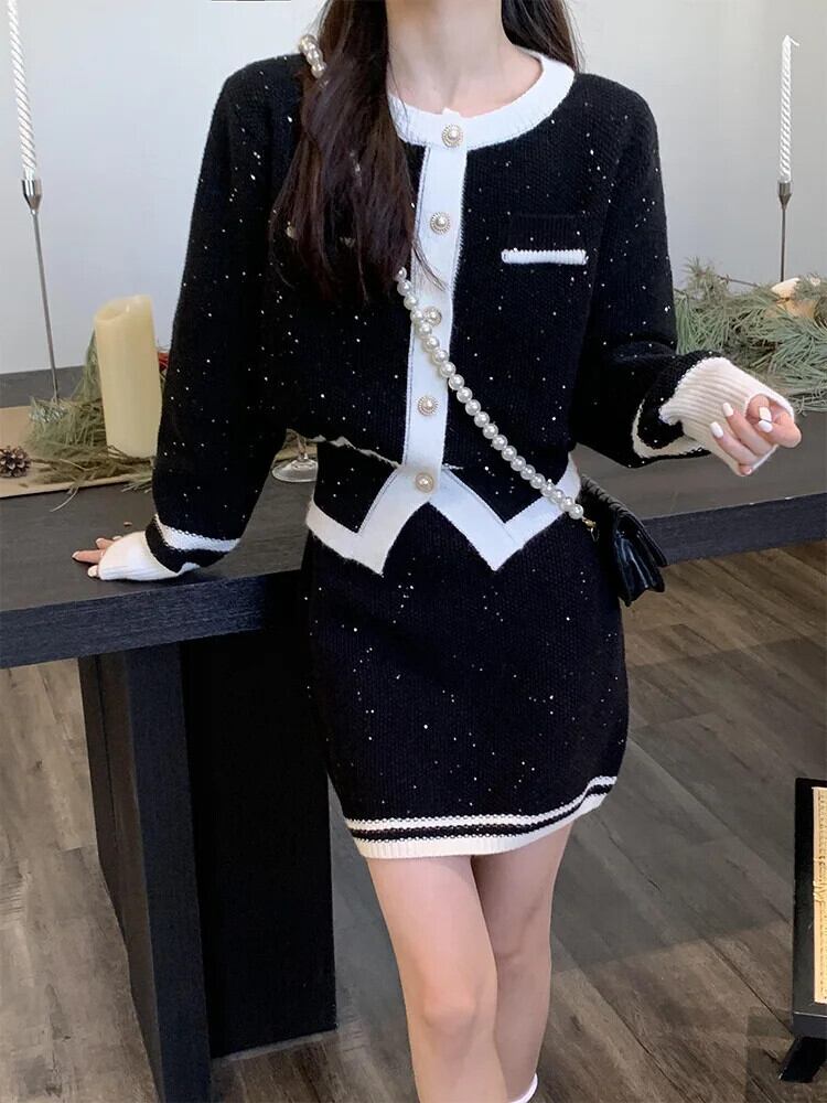 クリスマスレッドセータースリム 2 ピースセットレディース衣装ショートフレグランスセットニットミニ黒スカートセットシックスーツ Y2k ブラック