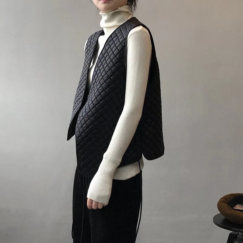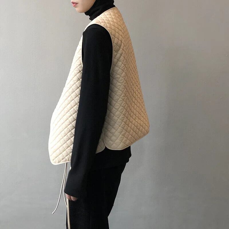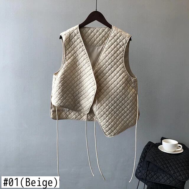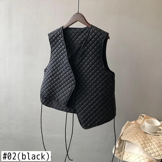 キルティングノースリーブ綿入りジャケットベスト秋冬ショートレトロルーズコートベストチョッキレースアップ黒パーカー ブラック コットン オータム 秋物 ウィンター 冬物