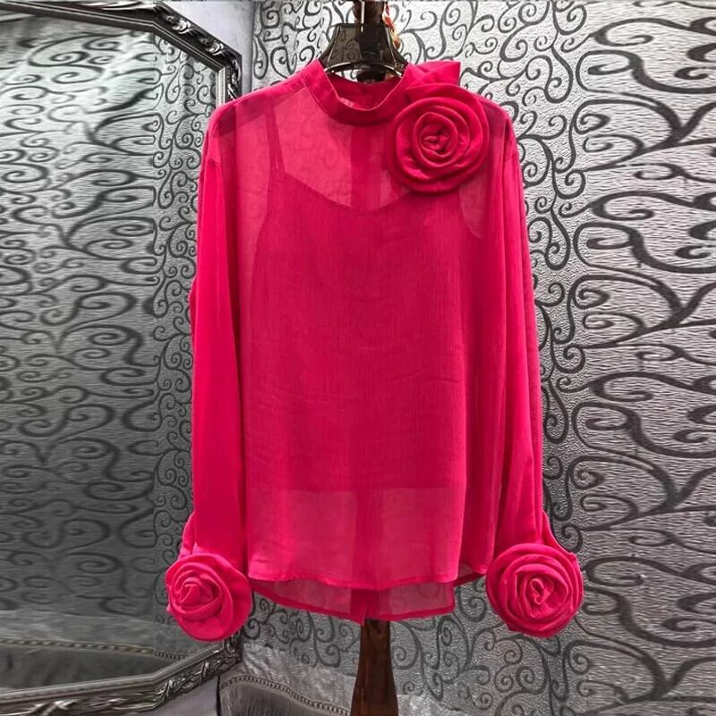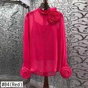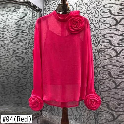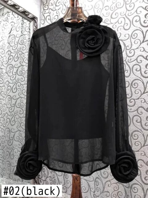 シャツフレンチ立体花プリーツトップス長袖ブラウスシフォン視点 ロング フラワーデザイン
