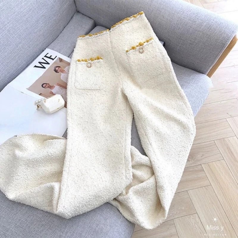 ワイドレッグパンツアプリコットパンツ春ニッチレトロウエストスリムウールパンツパンタロンブラックツイード スプリング 春物 ワイドパンツ