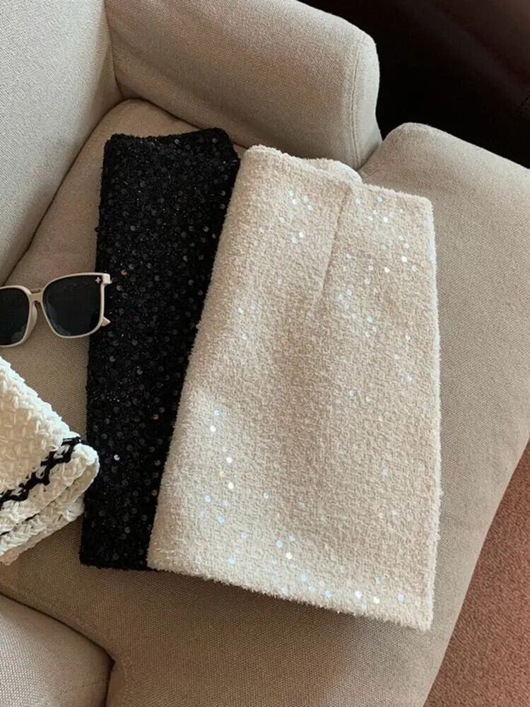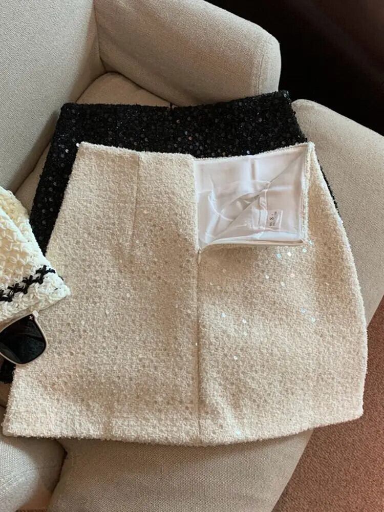ウエストスリムスパイシーガールラップヒップショート黒スパンコールスカート A ライン小さ香り厚いツイードスカート段段 ブラック Aライン