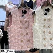 チョッキノースリーブダブルブレストラウンドネック小さ香りピンク電話ベストコート作物ツイードジャケットトップス甘い 大人ガーリー スウィート キュート カジュアル Oネック
