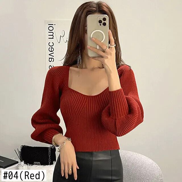 セーターズ デ クリスマス レッド ソフト スクエア ネック スリム フィット ランタン スリーブ ニット セーター 上下 ニット ジャージ Tシャツ ランタンスリーブ スクウェア