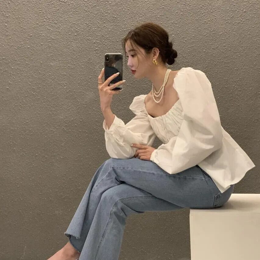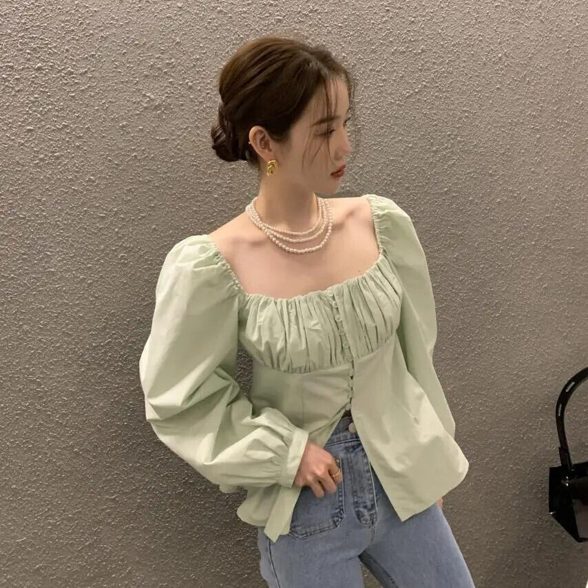 スクエアカラーオフショルダー優しいスタイル黒シャツスリムクロップトップセクシープリーツシングルブレストシャツブラウス ブラック スクウェア