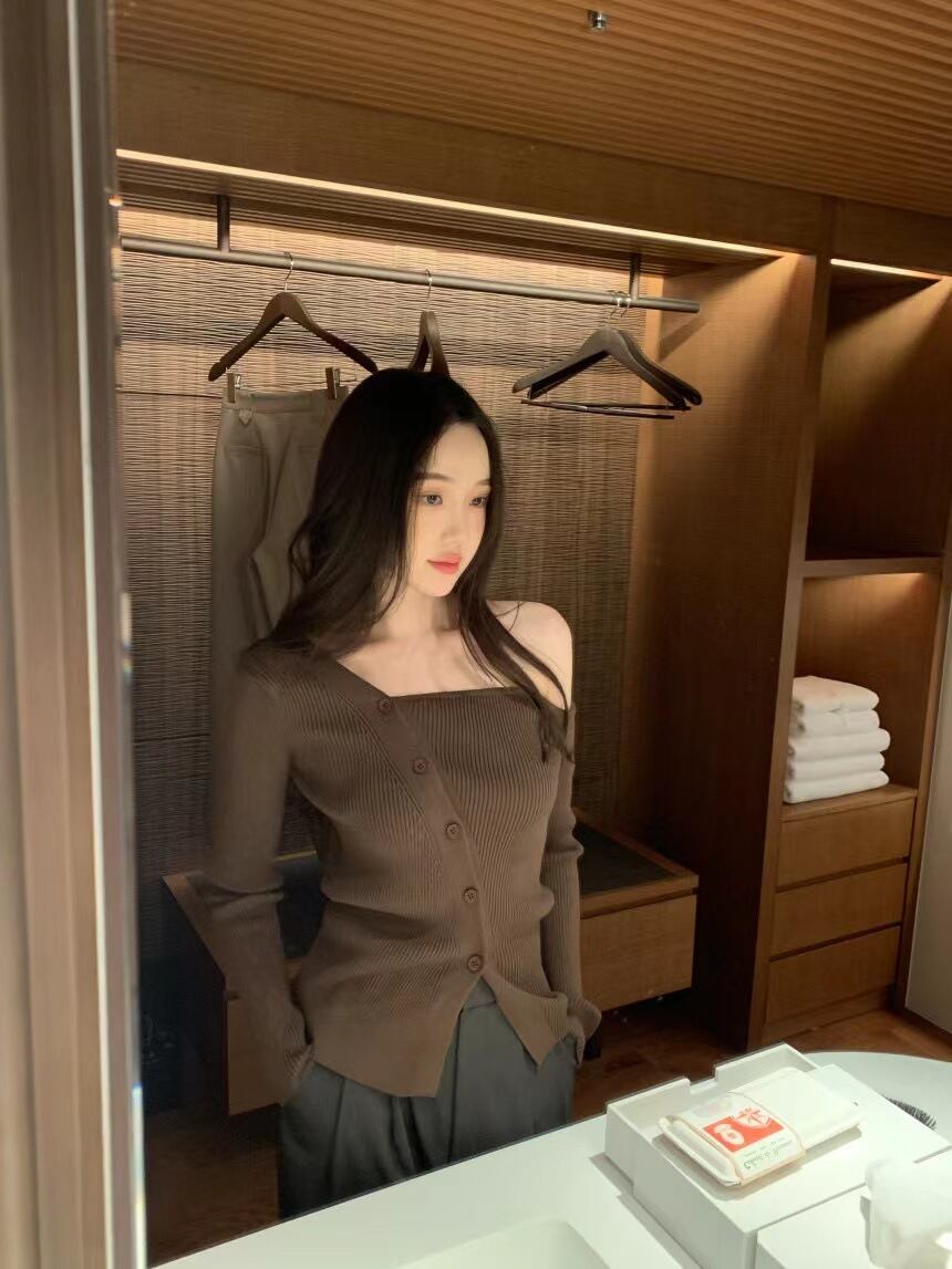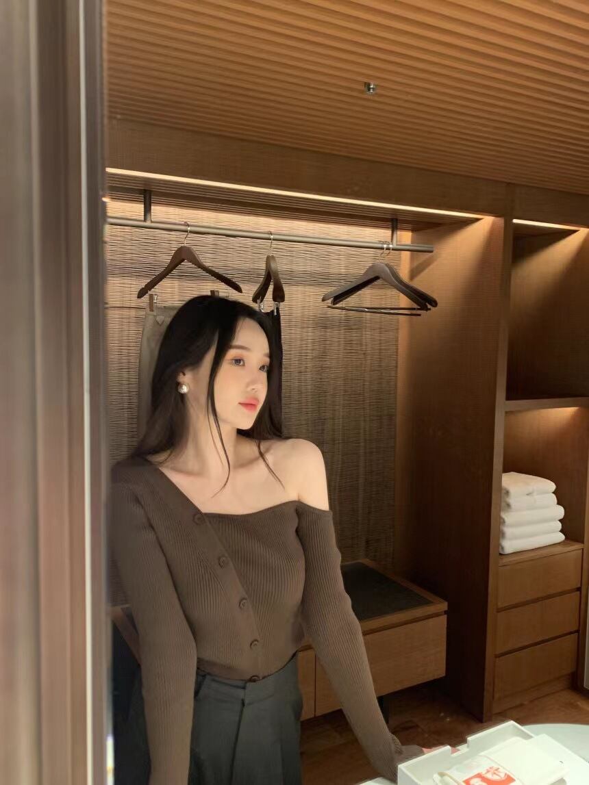 スリムシック秋ニッチ気質不規則斜め襟オフショルダーフィット長袖ニットトップ黒セーター ロング ブラック オータム 秋物