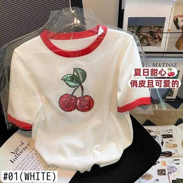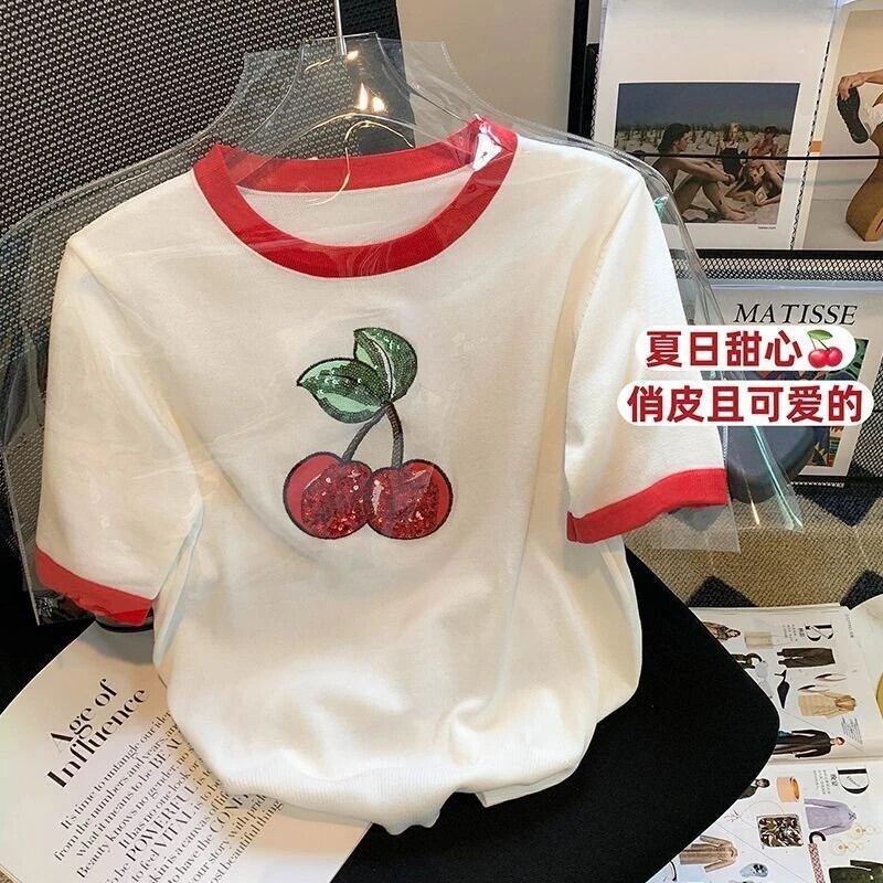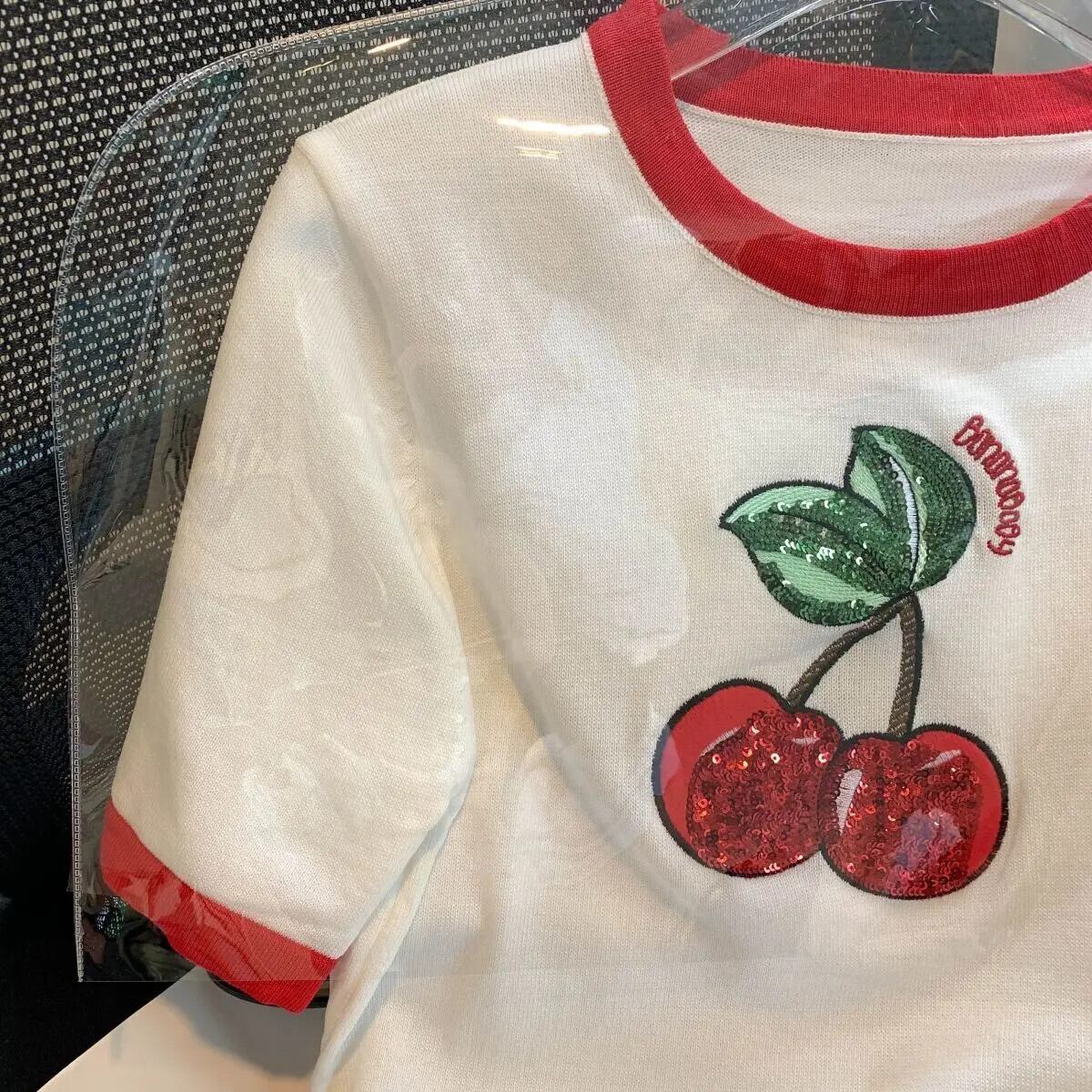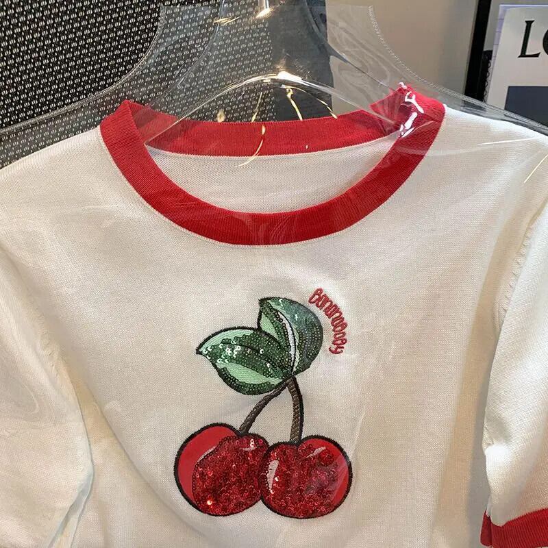 夏桜スパンコールニットセーター Tシャツ刺繍甘いトッププルオーバー半袖ルーズトップス ショート ハーフスリーブ 大人ガーリー スウィート キュート カジュアル サマー 夏物