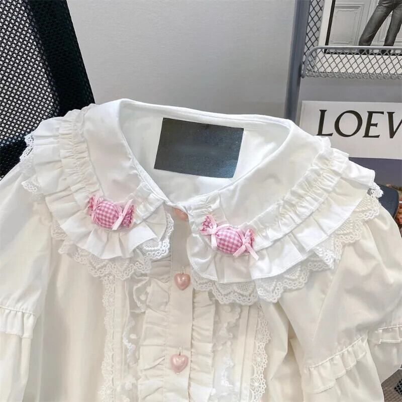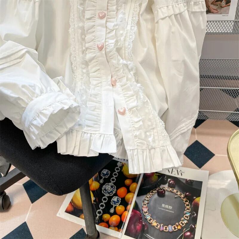 ese ソフトガールかわいい JK シャツ春プレッピースタイル白シャツレースパッチワークブラウスロリータトップ人形ネック ホワイト 大人ガーリー スウィート キュート カジュアル スプリング 春物