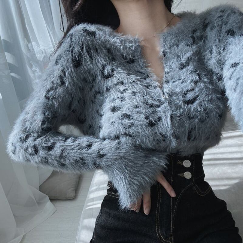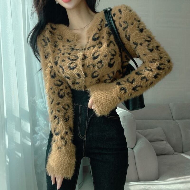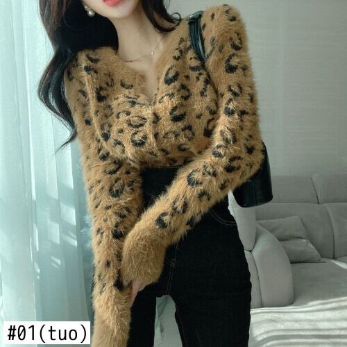 プル レディース ヒョウ カーディガン ジャカード ショート ニット スリム フィット 長袖 セーター セーター クロップド カーディガン トップ ロング