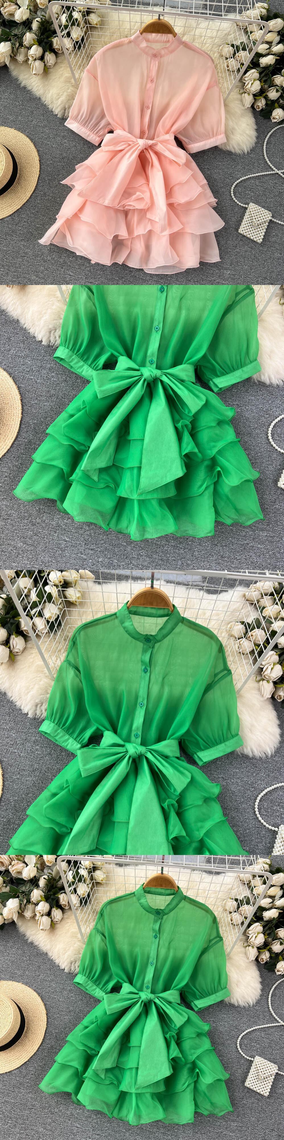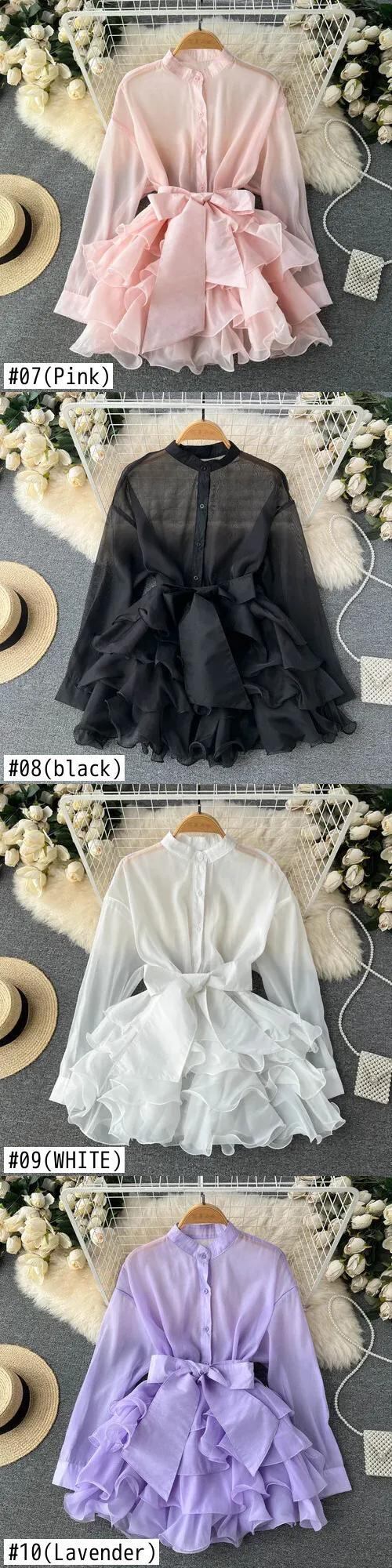 シフォンフレンチシックブラウス春長袖 O ネック無地ロングシャツトップスフリル ラッフル スプリング 春物 Oネック ソリッドカラー