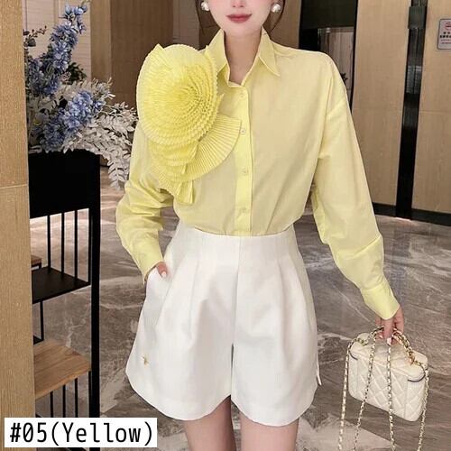 3D プリーツフラワースプライシング長袖シャツルーズソリッドブラウス春シャツ ロング スプリング 春物 ソリッドカラー フラワーデザイン