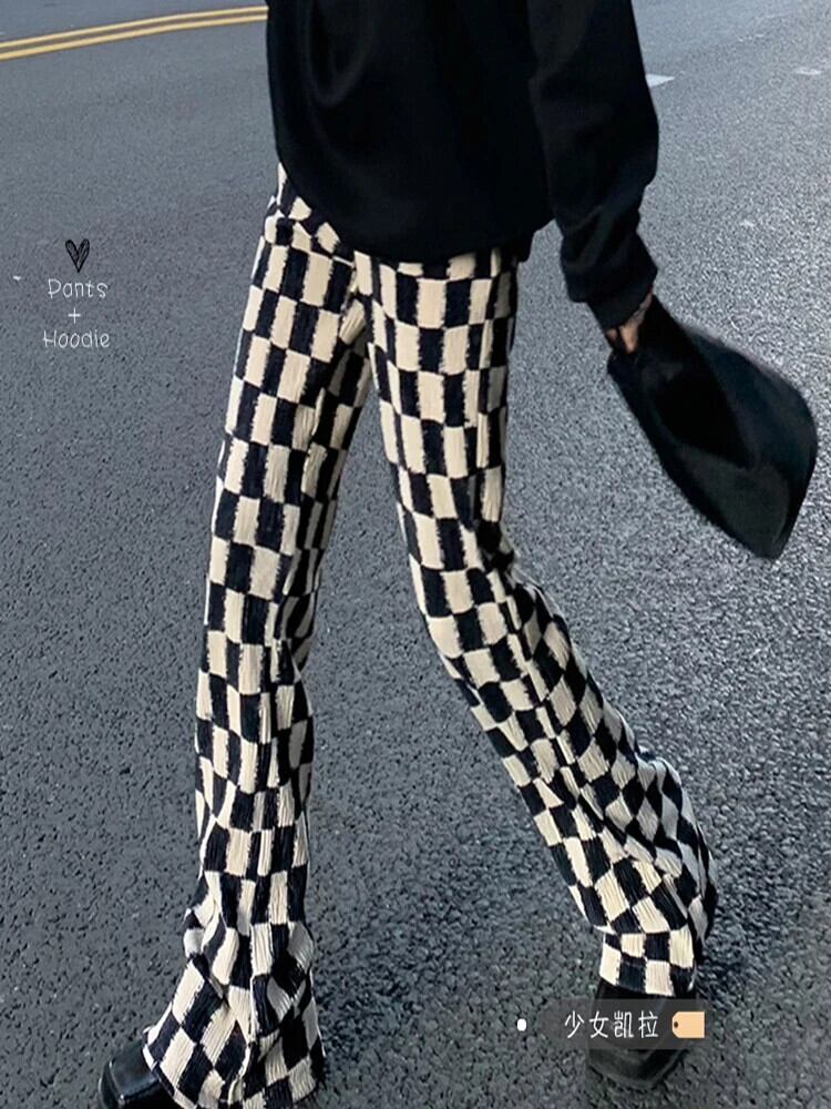ウエストフレアパンツストレート黒と白チェック柄チェッカーボードパンツルーズストリート Pantalones De ホワイト ブラック