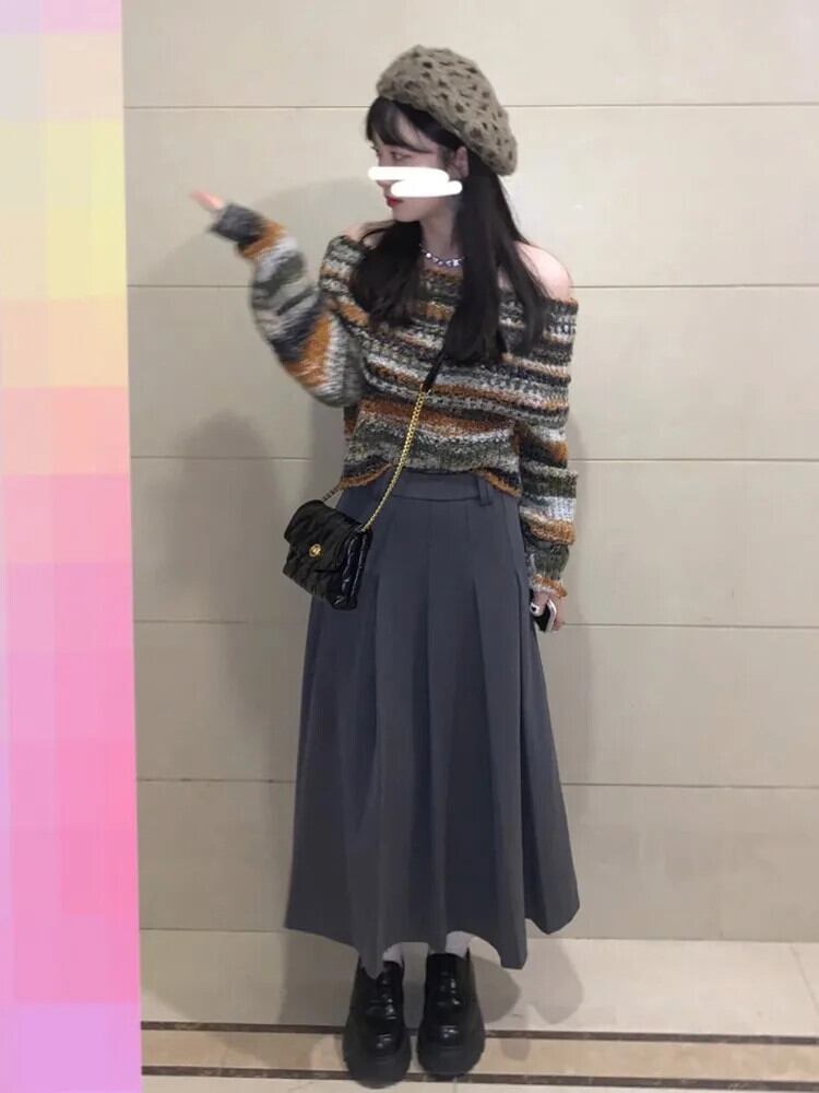 グラデーションスラッシュネックジャンパーカラフルストライプニット Y2k 美的アウターセーターコントラストカラー甘いプルオーバー 大人ガーリー スウィート キュート カジュアル