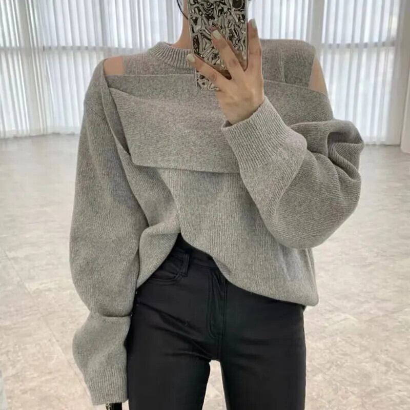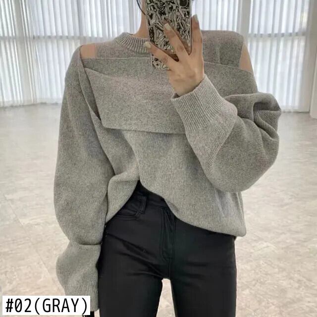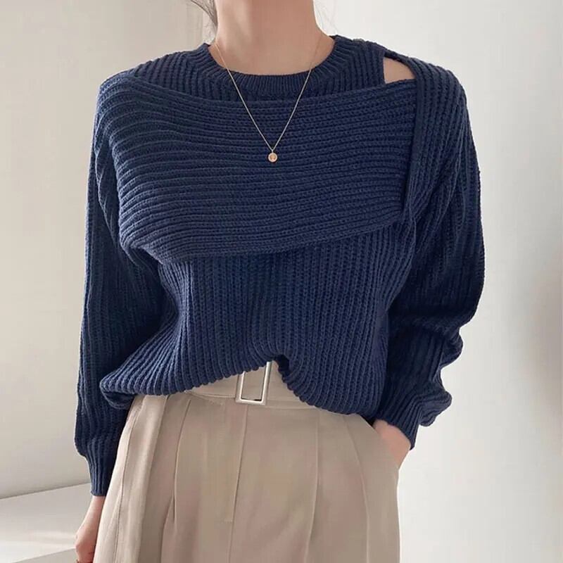 ブルーシックセーターアウトショルダーパッチワークルーズニットトップスオフィスレディプルオーバーシャツ シャツ オフショルダー 会社 学校 通勤や通学にも