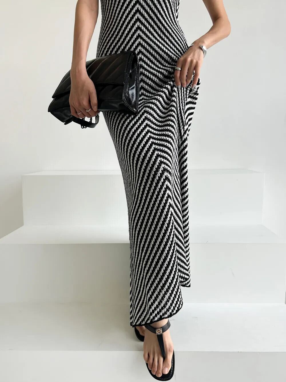 ニットドレスローブボディコンラウンドネック黒ストライプドレスコントラストカラーパッチワーク臀部スリムノースリーブニットドレス ブラック Oネック
