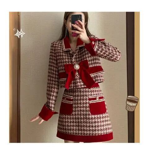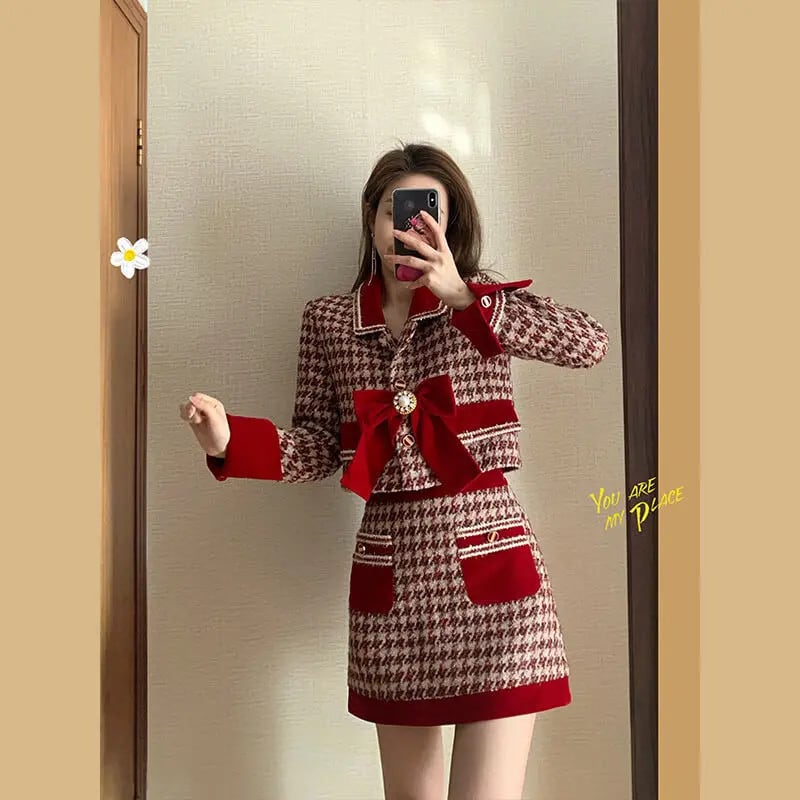 ショートキルティングコートボウテーラード2ピースセットレディース衣装ミニ千鳥格子スリムクロップドジャケットトップススカートセット レッド リボン