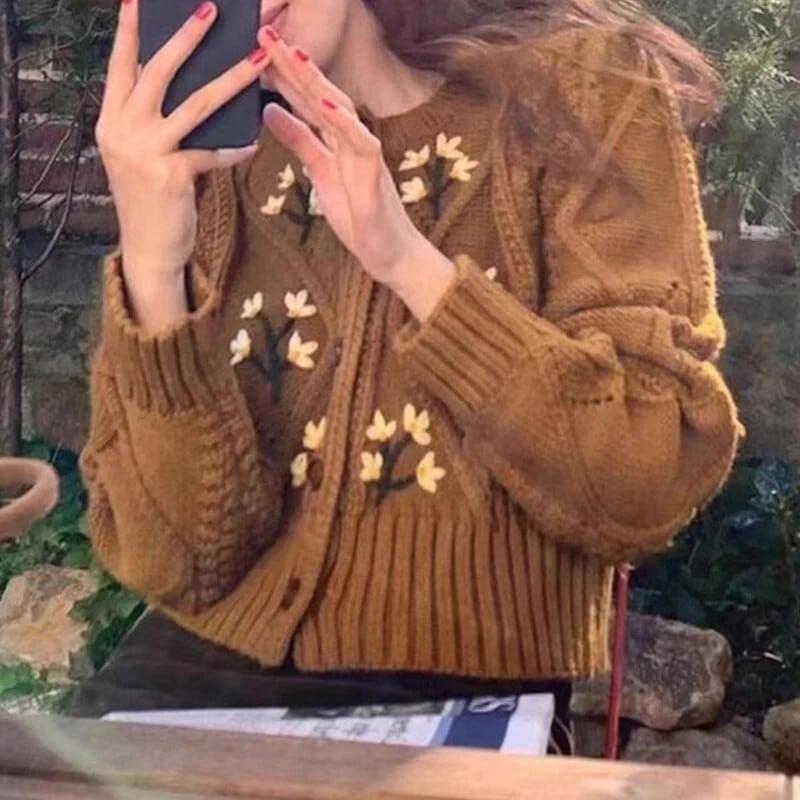 刺繍花柄ニットカーディガン小さ香り優しいスタイル長袖カーディガンシングルブレストクロップトップレトロセーター ロング