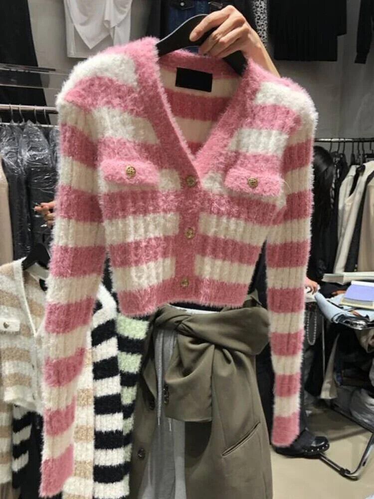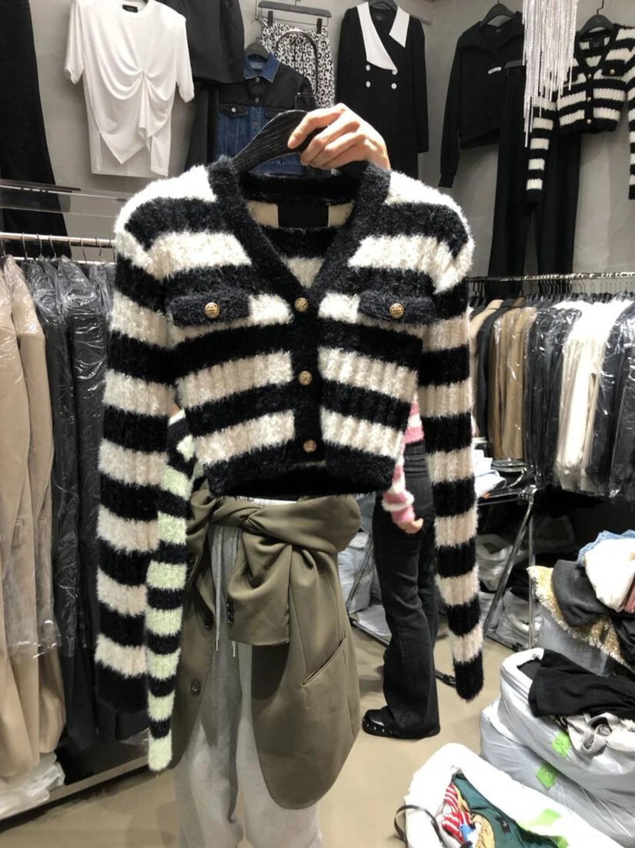 ストライプカーディガン V ネッククロップドセクシーオールマッチイントレンディ優しいスリムセータートップ Vネック