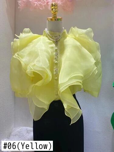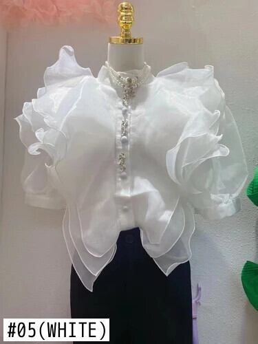 宮廷スタイルレイヤードフリルオーガンザシャツブラックトップスパフ半袖シングルブレストホワイトシフォンブラウス ショート レッド ハーフスリーブ ラッフル