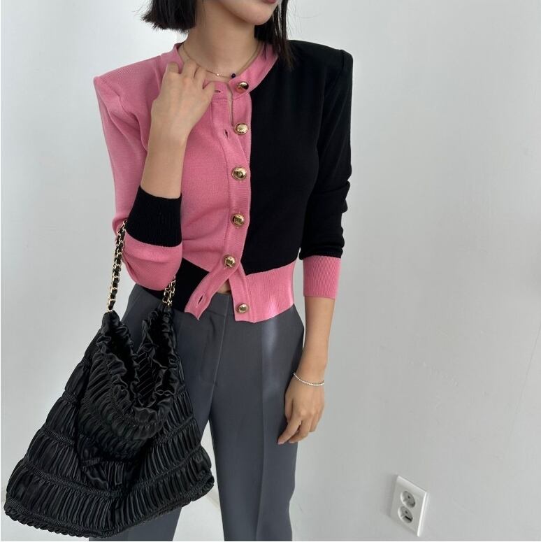 セーター秋スリムレトロプルニットカーディガン袖ラウンドネックメタルコントラストカーディガン Feminino トップ オータム 秋物 Oネック