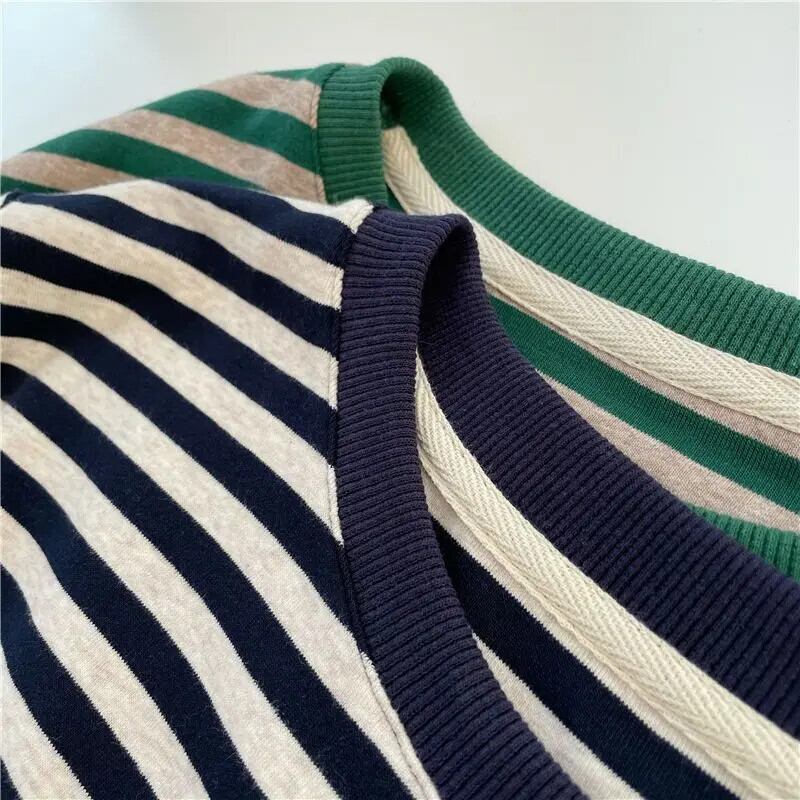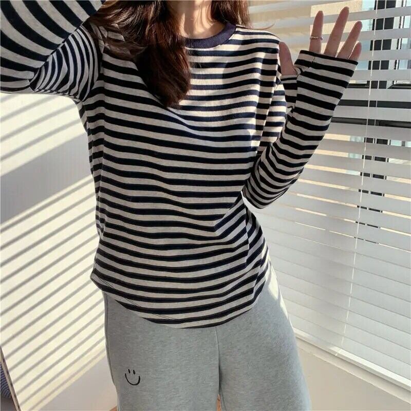 綿グリーンストライプ Tシャツ長袖 Tシャツトップ Ropa グラフィック Tシャツ Tシャツボトムルーストップス ロング コットン