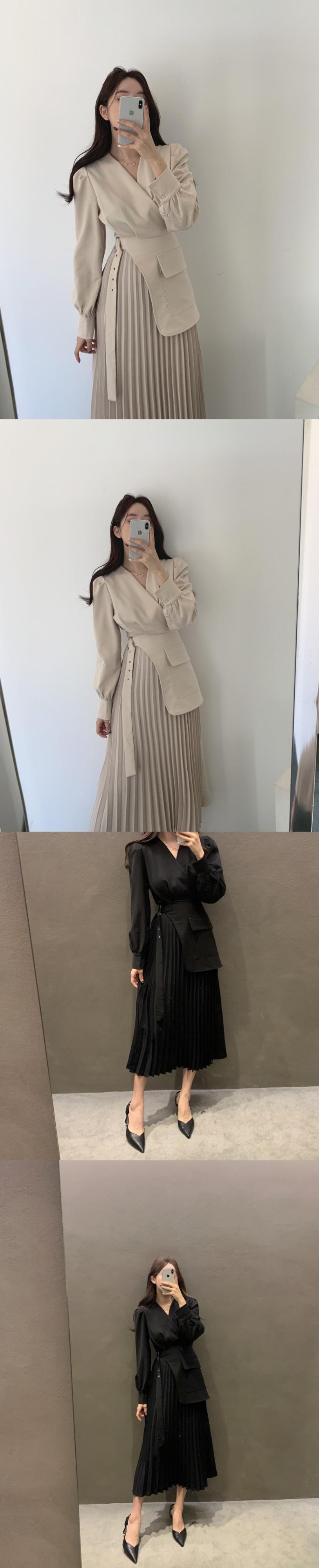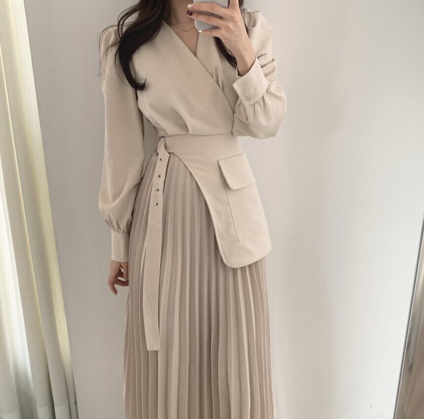 オフィスレディ Vestidos ロングドレス黒誕生日パーティースリムフェイク 2 秋 V ネック袖プリーツドレススリーブ ブラック オータム 秋物 Vネック 会社 学校 通勤や通学にも