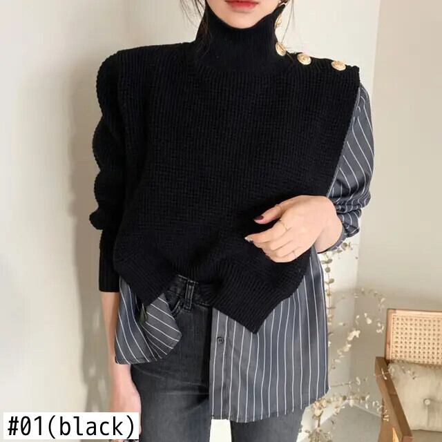 パッチワークプリントストライプセータータートルネック長袖セータートップニット ロング