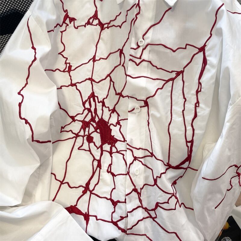 ストリートヒップホップスパイダーウェブ刺繍長袖ブラウス原宿トップシャツ Y2k 美的グランジ白シャツ ロング ホワイト かわいい