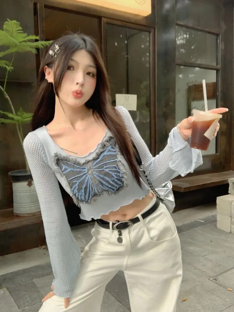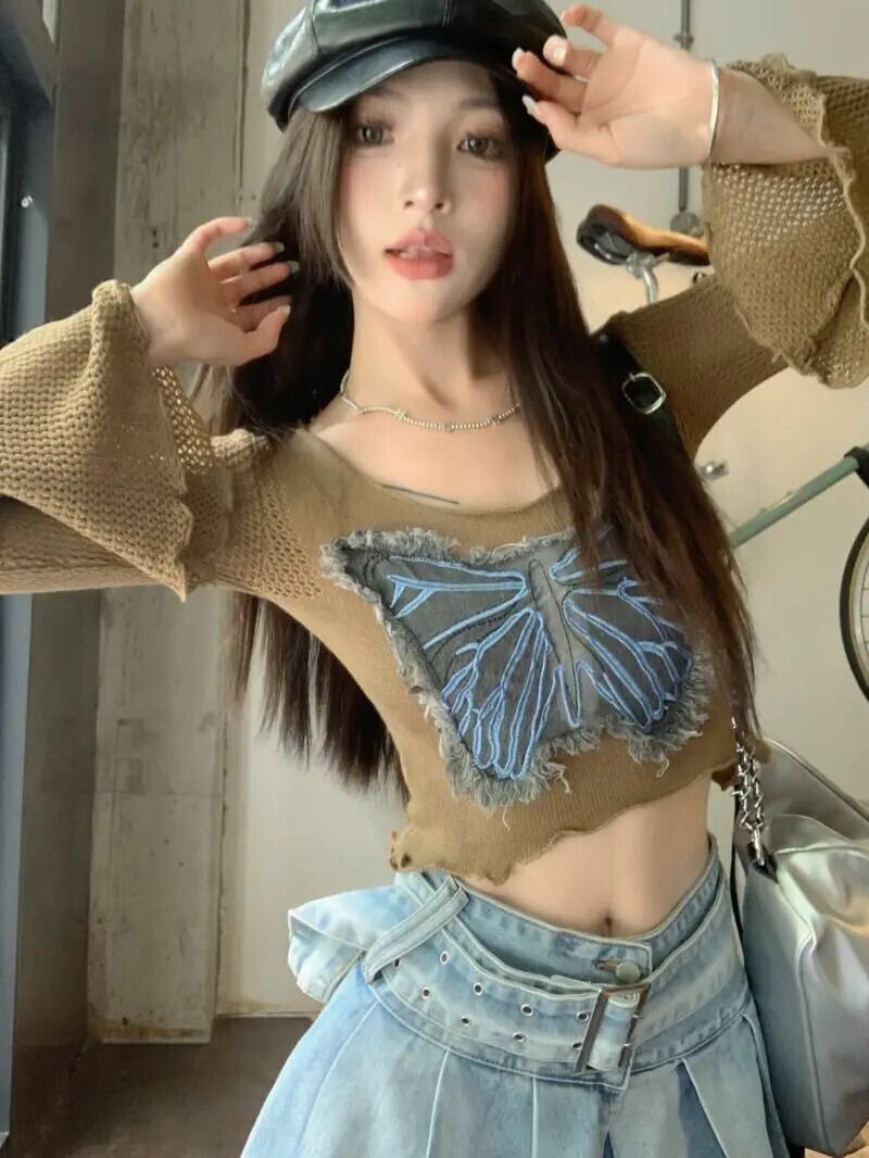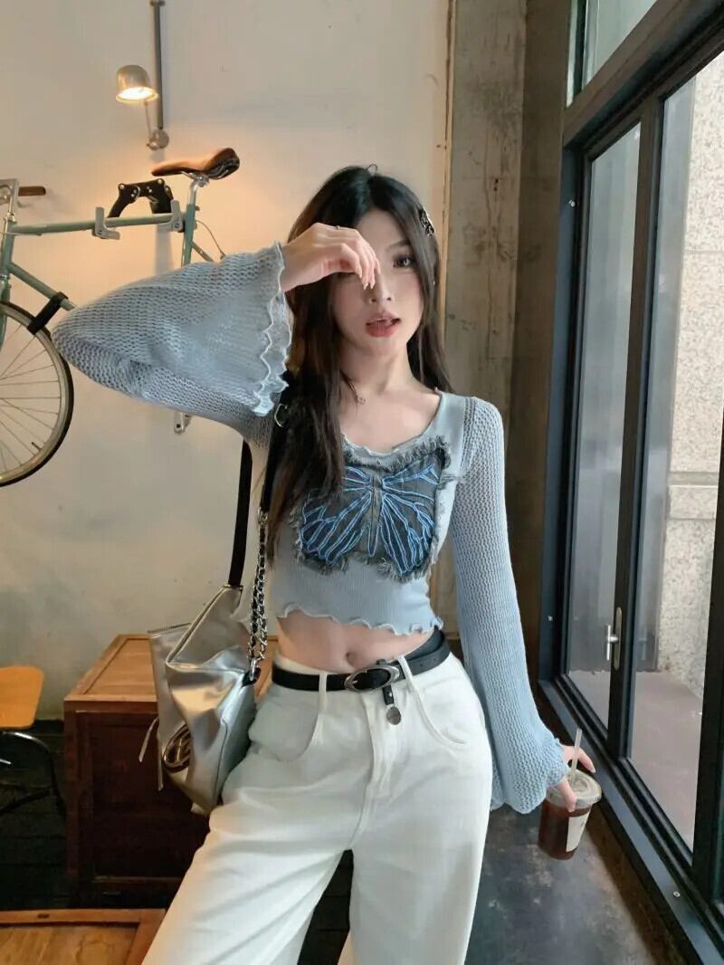 グランジクロップトップ美的グラフィック Tシャツフレアスリーブニット蝶セーターショート木耳トップ Tシャツセクシー