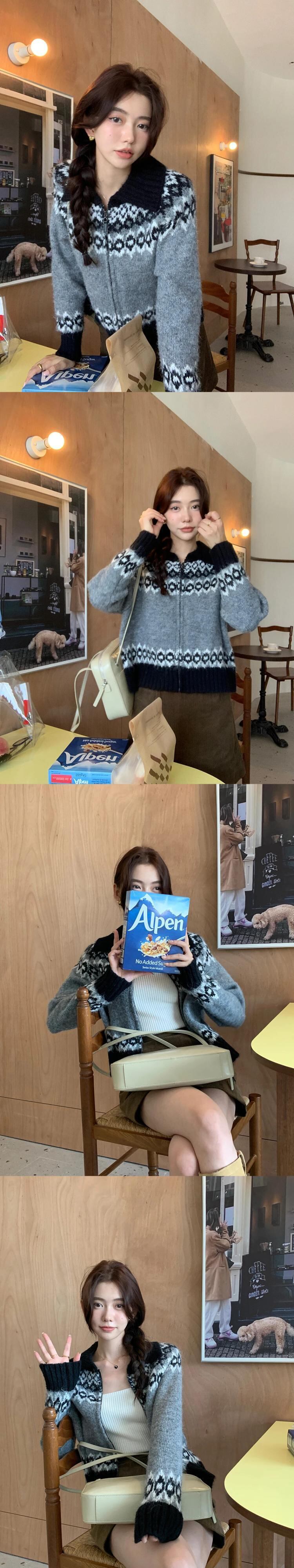 秋レトロニッチラペルコントラストカラージャカードジップアップルーズ長袖ニットアウターカーディガンセーター ロング オータム 秋物
