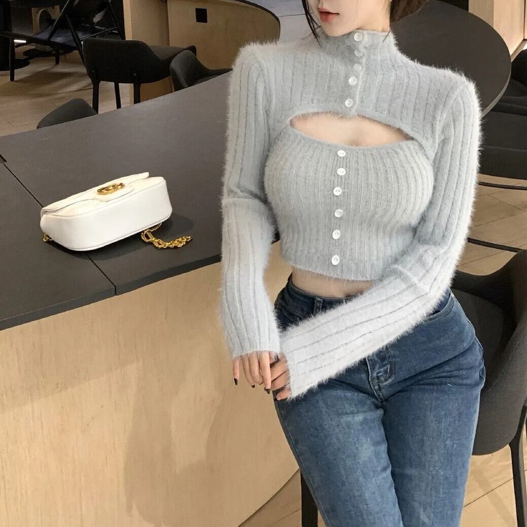 ハーフカラーセーター長袖トップミンクカシミヤ甘いソリッドソフトモヘアピンクセーターセーターデクロップホワイト ロング 大人ガーリー スウィート キュート カジュアル ソリッドカラー