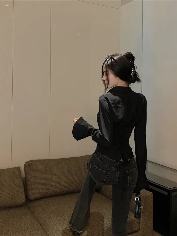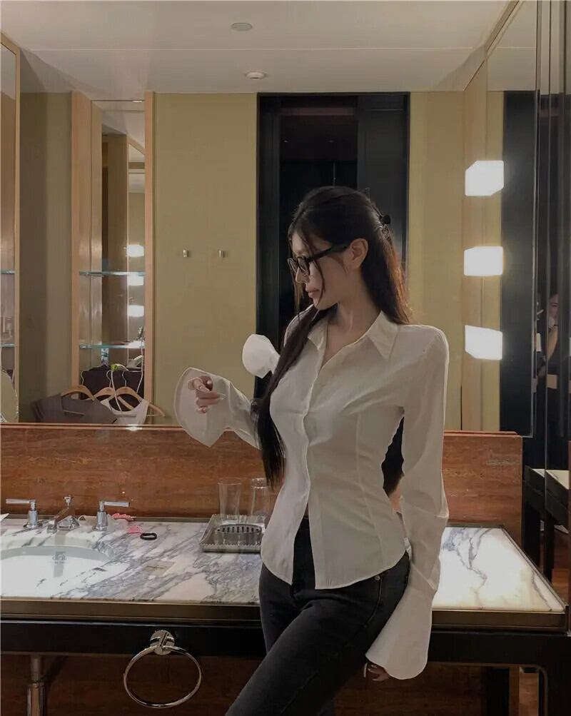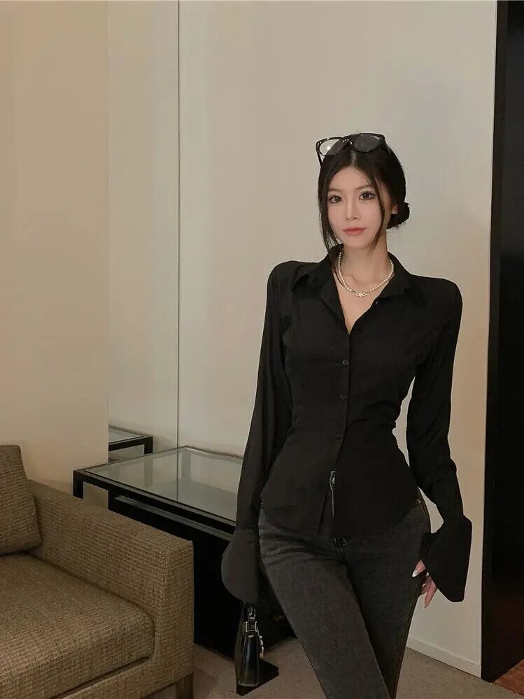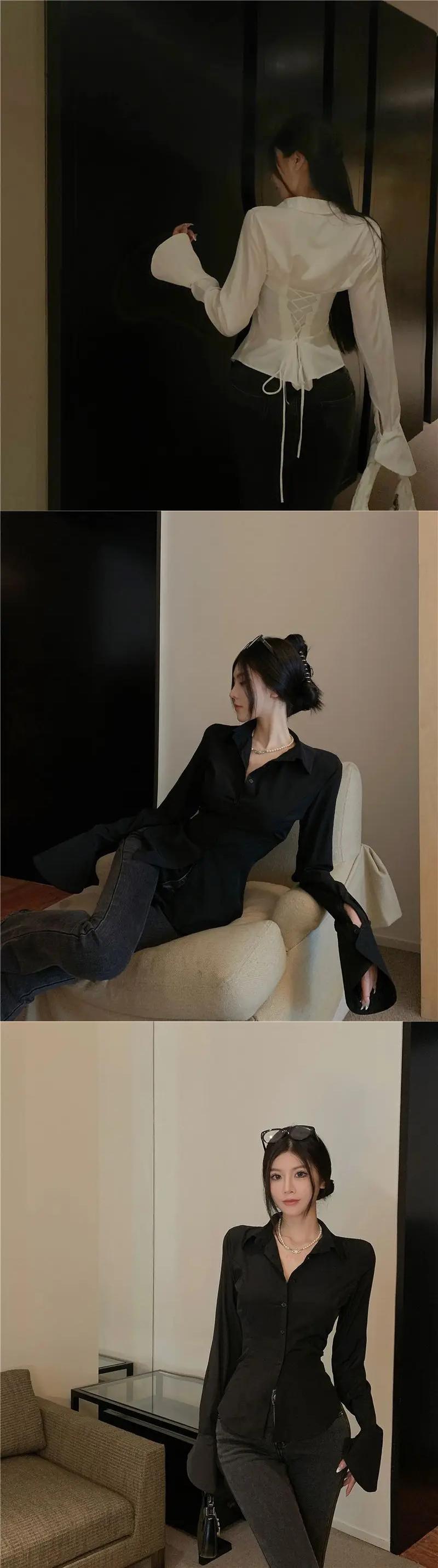 レトロ無地スリムシフォンシャツターンダウン襟フレアスリーブチュニック包帯ブラウス春夏 スプリング 春物 サマー 夏物 ソリッドカラー