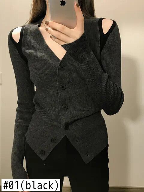 ブラック オフショルダー ニット セーター レディース 秋 ニッチ スリム ボトリング シャツ トップ Y2k クロップ カーディガン オータム 秋物