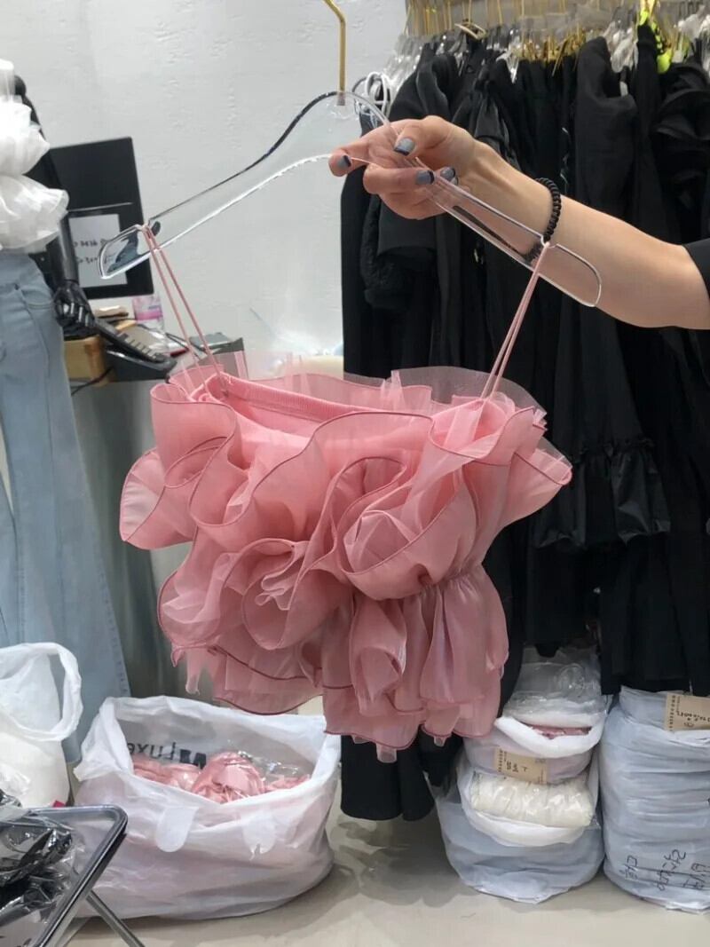 ピンククロップトップ Ropa セクシータンクひだ背中開いたスリングベストシフォン甘いフリルキャミソールシック Y2k トップス ラッフル 大人ガーリー スウィート キュート カジュアル