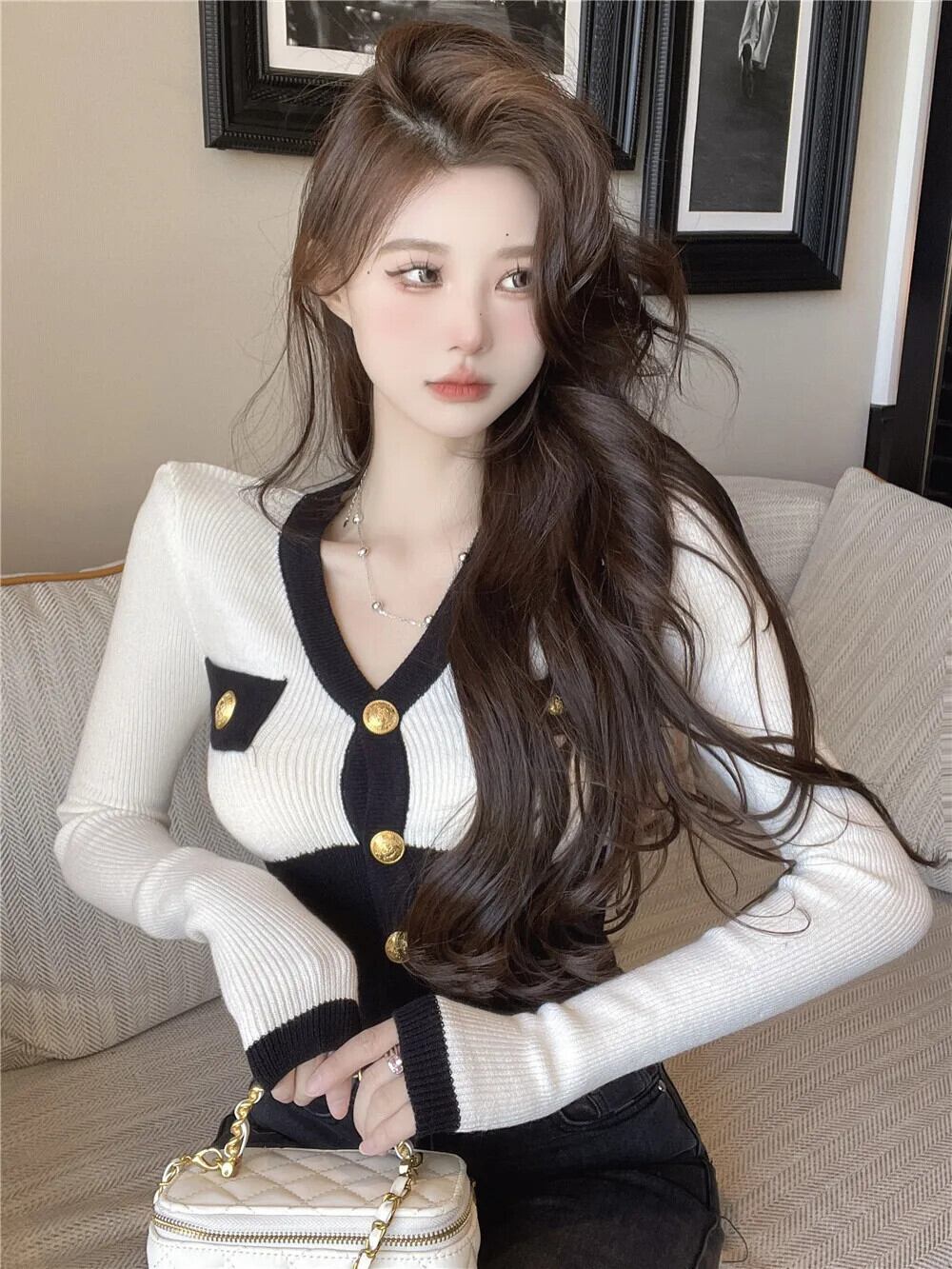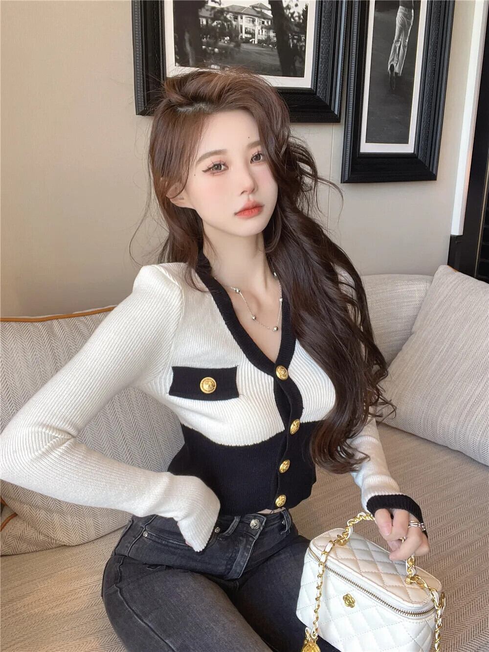 セクシー V ネックセーター秋コントラストメタルボタンニットトッププルクロップドカーディガンスリムシャツ オータム 秋物 Vネック