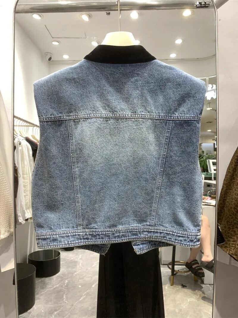 デニムベストレトロゴールドベルベットパッチワークベスト秋シングルブレストショートトップ Y2k クロップドジャケット Chalecos オータム 秋物