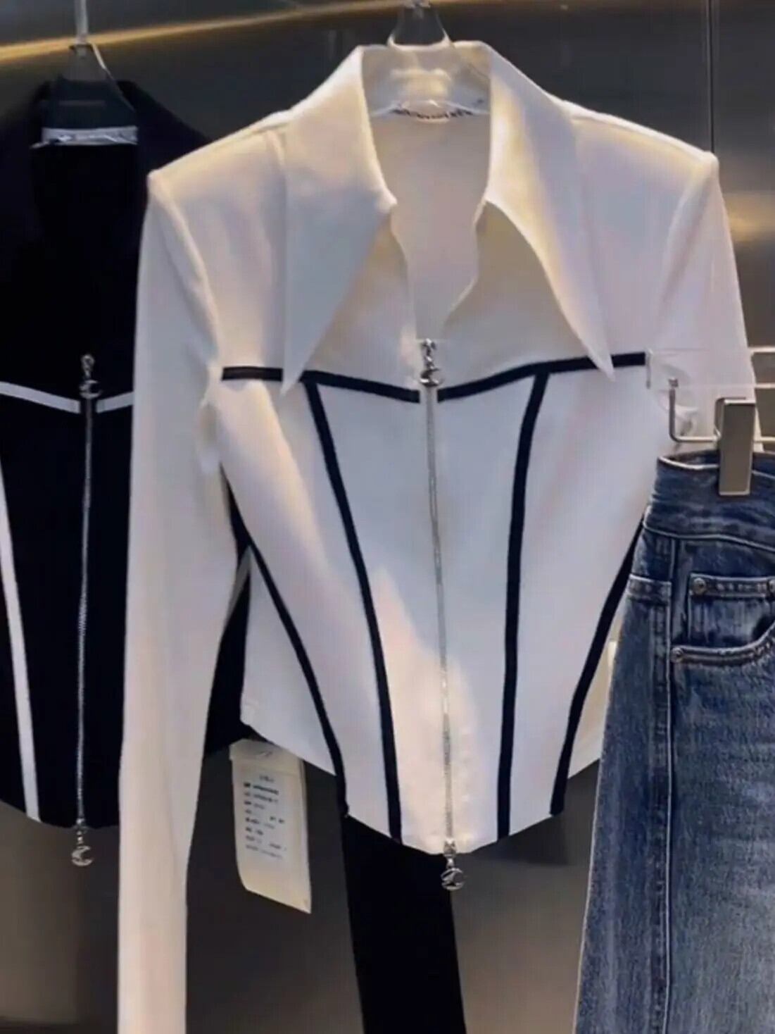 ブラウス長袖チュニックジッパーシャツデモーダ気質トップス白クロップトップス ロング ホワイト