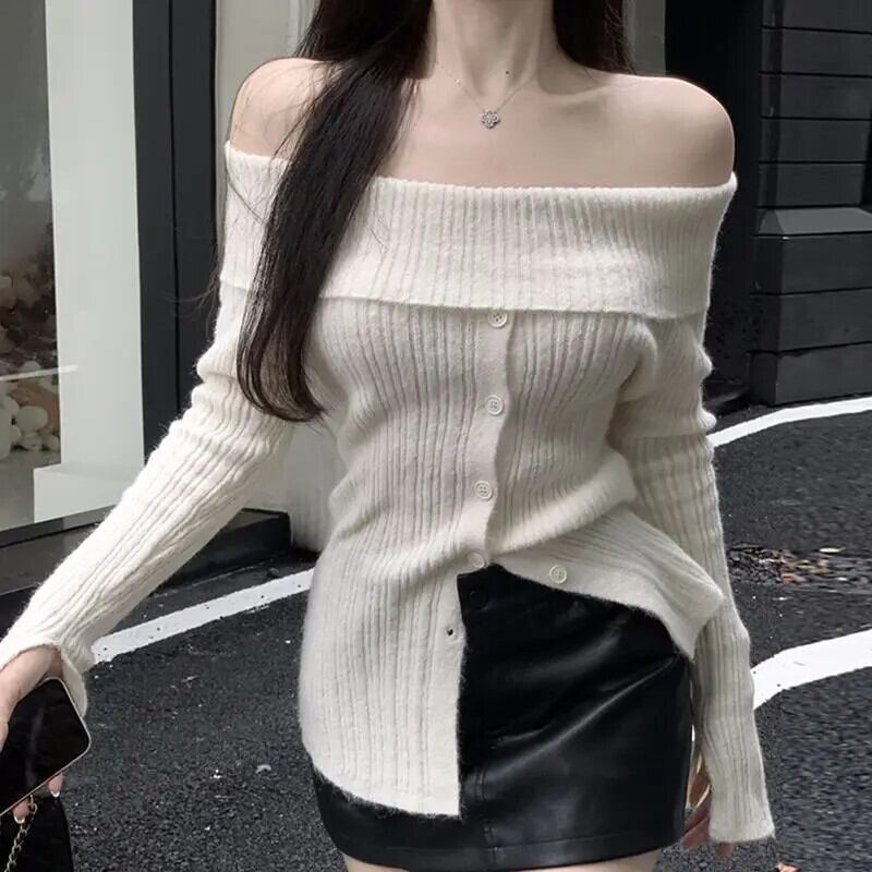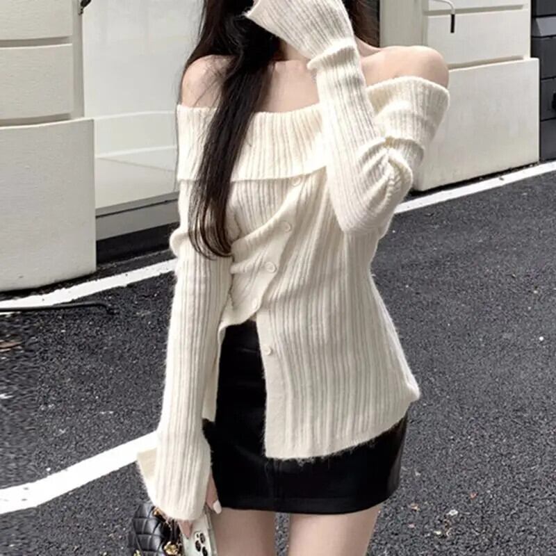 Y2K ジャンパースラッシュネックボタンかわいいセーター背中開いたフルスリーブ原宿シックプルオーバーフレンチスラッシュショルダートップス 大人ガーリー スウィート キュート カジュアル