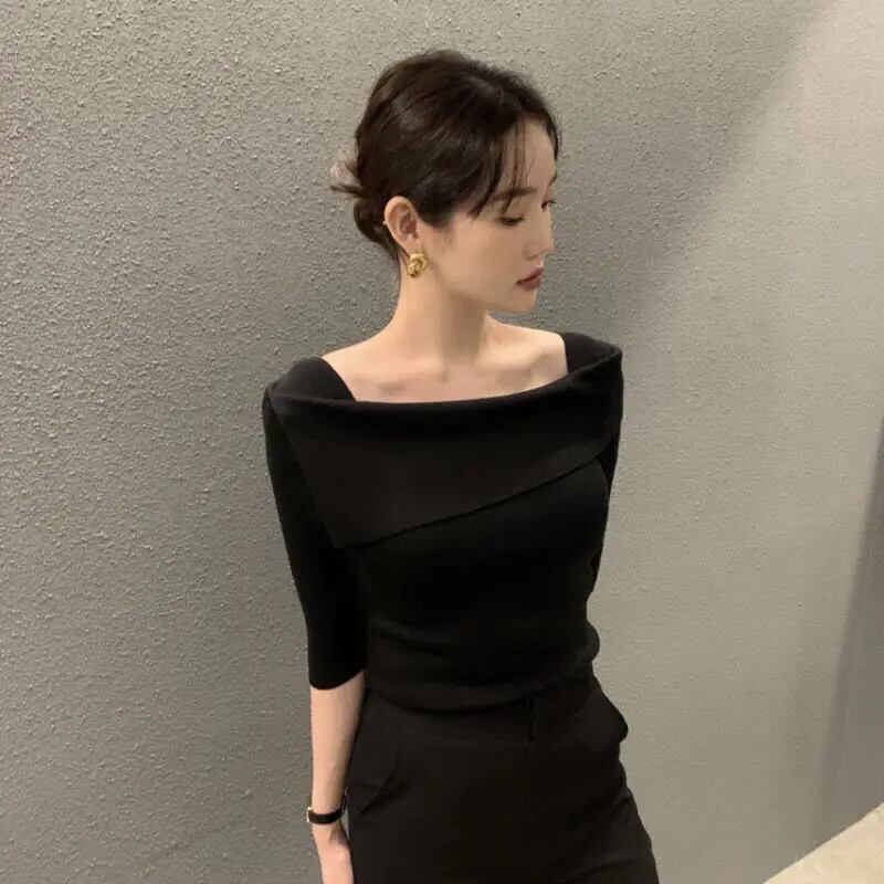 黒人ガールズ Tシャツ夏レトロニッチラペル襟トップスリムフィットシンプルソリッドカラー半袖ニット Tシャツ ショート ブラック ハーフスリーブ サマー 夏物