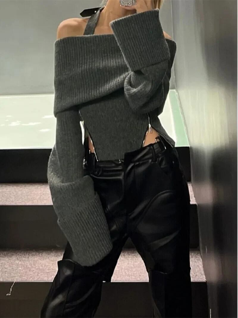 プルオーバー グレー スラッシュ ネック ホルター セーター Y2k 美的ニット ソリッド ジャンパー セクシー スリム ジッパー シック レイヤード ソリッドカラー