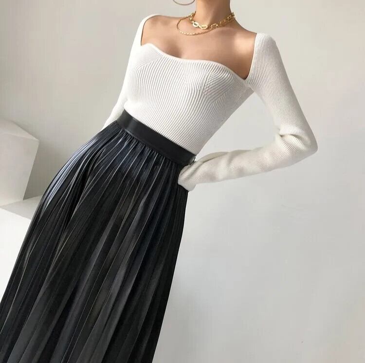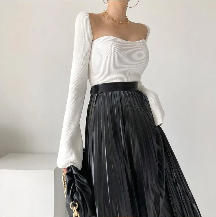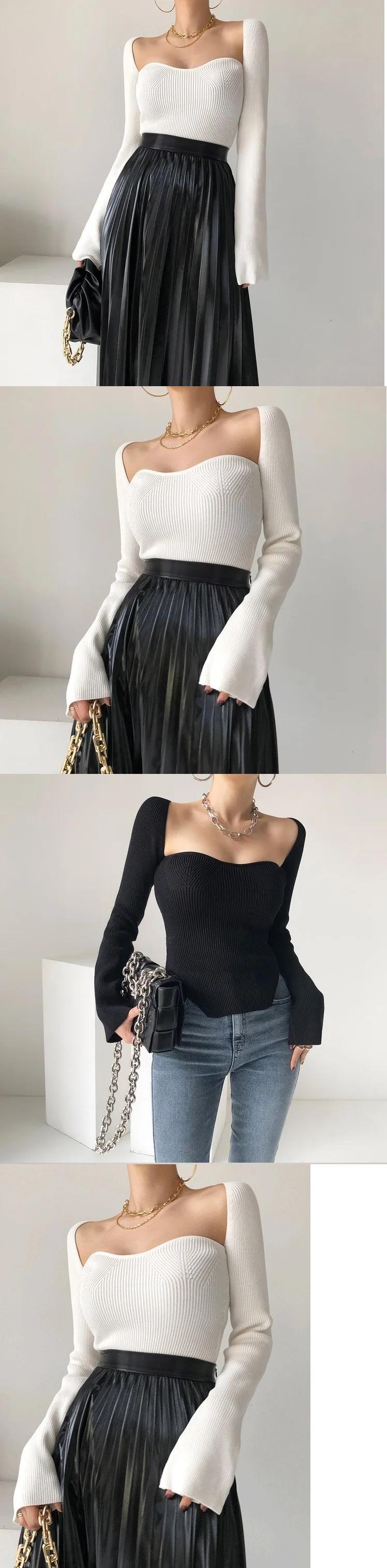 セクシースクエアネックセーター秋薄い長袖サイドスプリットスリムプルオーバーニットトップ黒 Tシャツクロップトップ ロング ブラック オータム 秋物 スクウェア